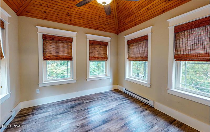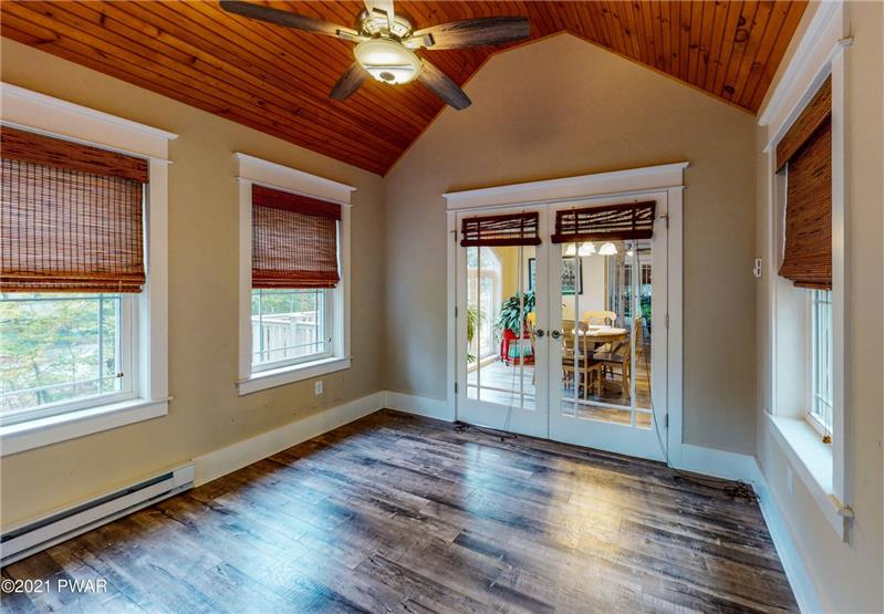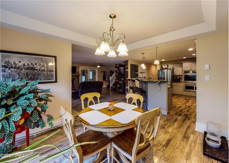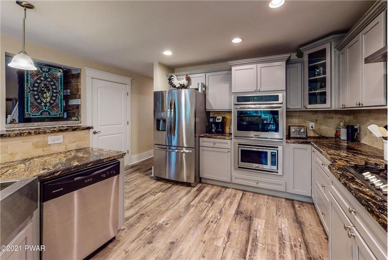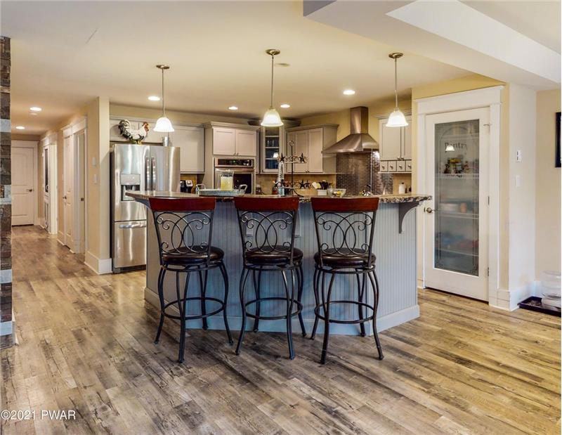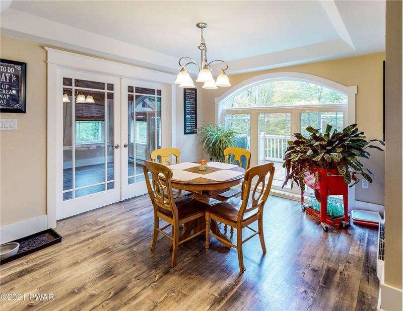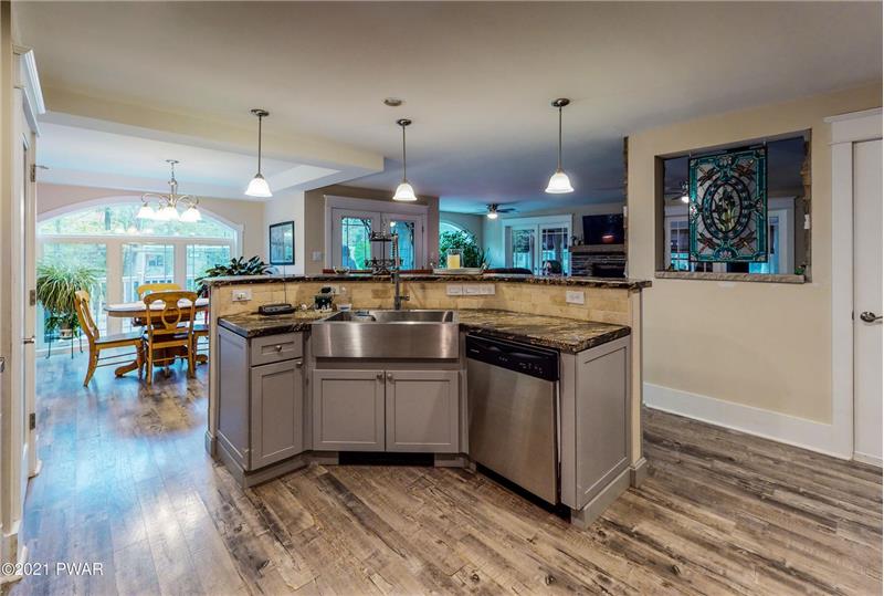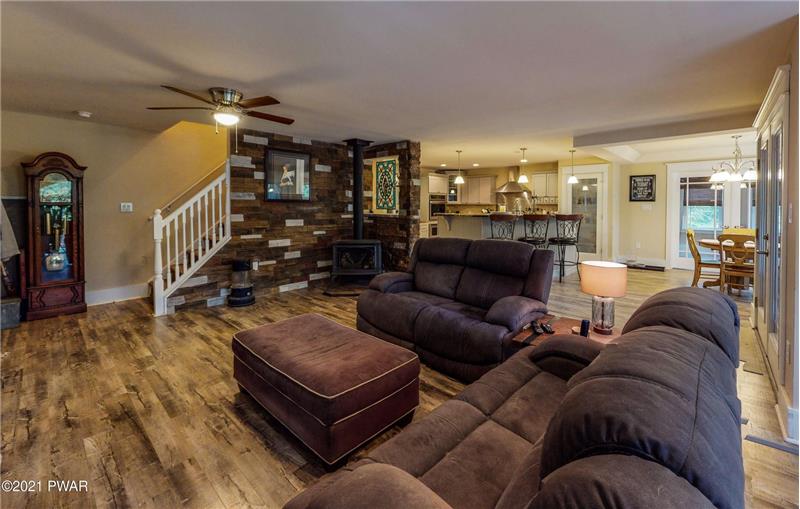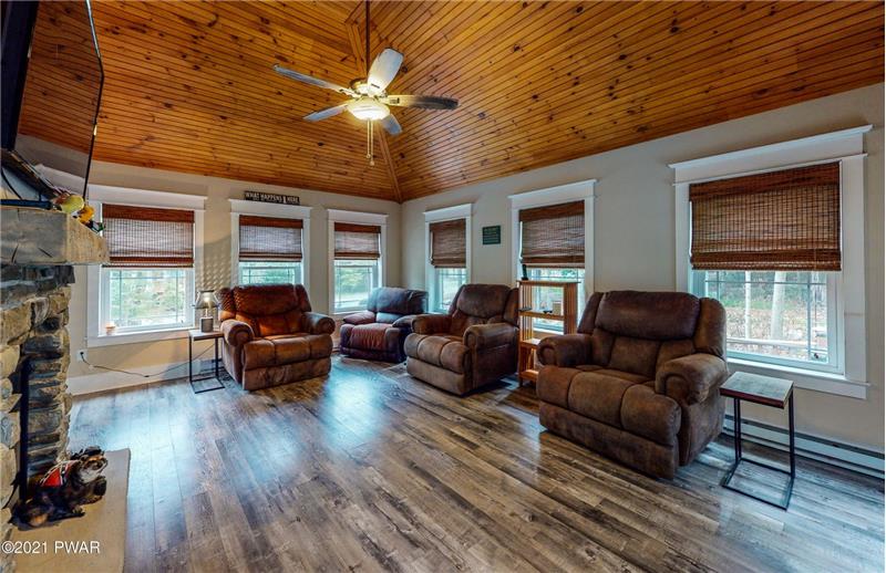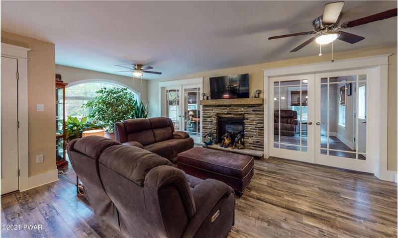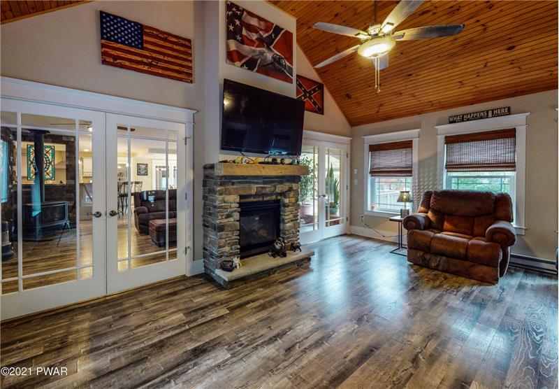 Spectacular, 3 bedroom, Hideout Cape Cod! Large den with double sided fireplace, beautiful tongue and groove ceiling leads to double sets of French doors leading to living room with fireplace, stone accent wall, freestanding stove and beautiful arched windows. Continue on through the open floor plan to the awesome kitchen with large farmhouse sink, stainless steel appliances, pantry, dining area and breakfast bar. Beyond that is a sunny light filled room perfect for a dining room or use as a sunroom. The entrance to the home and the first floor are handicapped accessible!