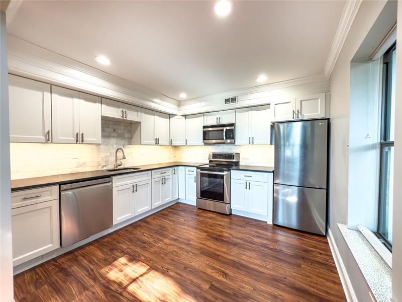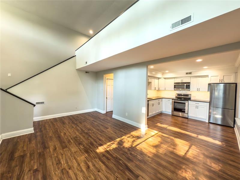 Beautiful 3BR, 2.5BA home condo in Lower Merion SD. A bright two-story foyer leads to open living & dining with updated laminate floors and sliders to a private patio. The 2020 kitchen features LG stainless appliances, granite counters & modern lighting. Main floor powder room and laundry with storage. Upstairs, a great room with atrium window and fireplace. Top-floor primary suite with en-suite bath plus 2 bedrooms sharing a skylit hall bath. New Lennox HVAC (2020), 2 parking spots, low-maintenance living near Suburban Square, SEPTA & Amtrak.