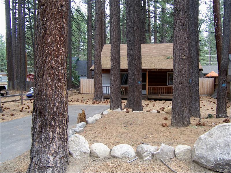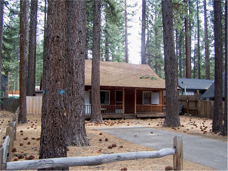 Lake Tahoe charm welcomes you when you enter into this 2-Story LOG CABIN nestled under the pines. Large living room and adjacent dining room are enhanced by interior log and knotty pine walls. Warm up and relax in front of the gas fireplace. The Sunny Kitchen has access to the rear yard & deck. One bedroom with log accents is on the lower level plus two more bedrooms on the upper level with vaulted ceilings. There is a rear deck plus storage shed. The cabin is set back off the street for privacy. Enjoy the beauty of Lake Tahoe while relaxing on your front porch. Centrally located, this cabin i