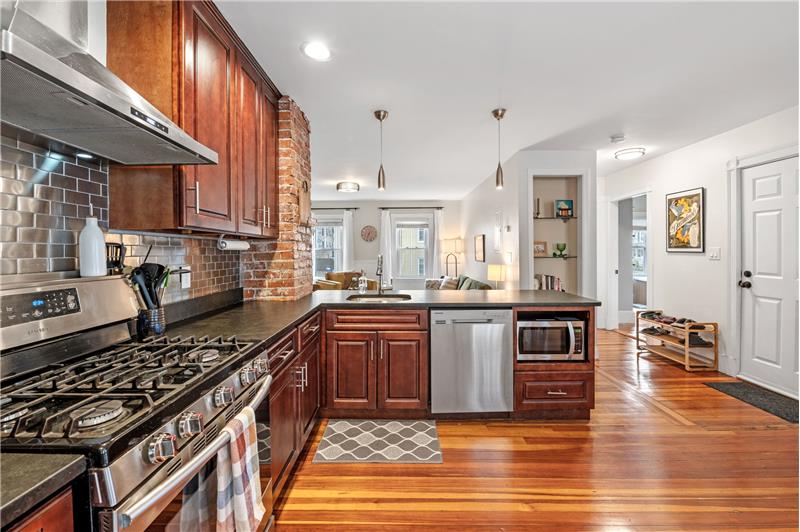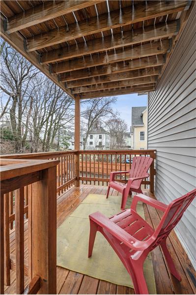 Beautiful, expansive 3bed/1.5bath condo with front & back decks, 1 garage + 1 outside parking space, central A/C, in-unit laundry & storage room + cedar closet. Fabulous layout flows from eat-in-kitchen to living room with bedrooms separated. Kitchen features warm brick accents, stainless appliances & 5 burner gas cooking with range hood. So easy to entertain inside or outside on front or back deck! All bedrooms easily fit a queen sized bed or create work-from-home space. Renovated baths & 1/2 bath has charm of original details. Solid condo assoc, professionally managed, all owner occupied.