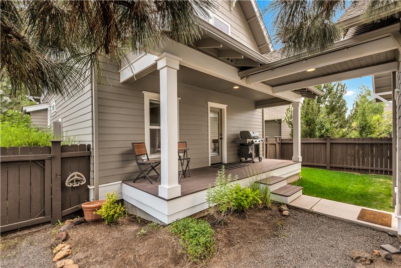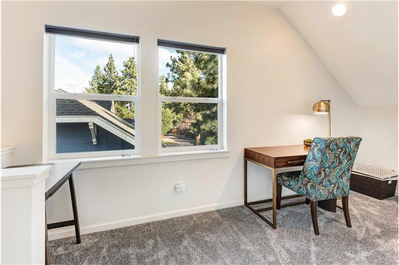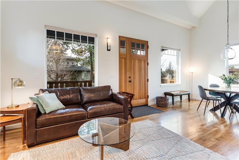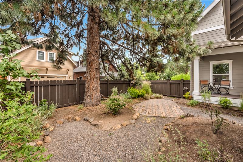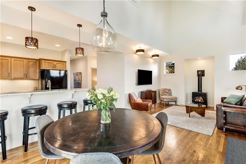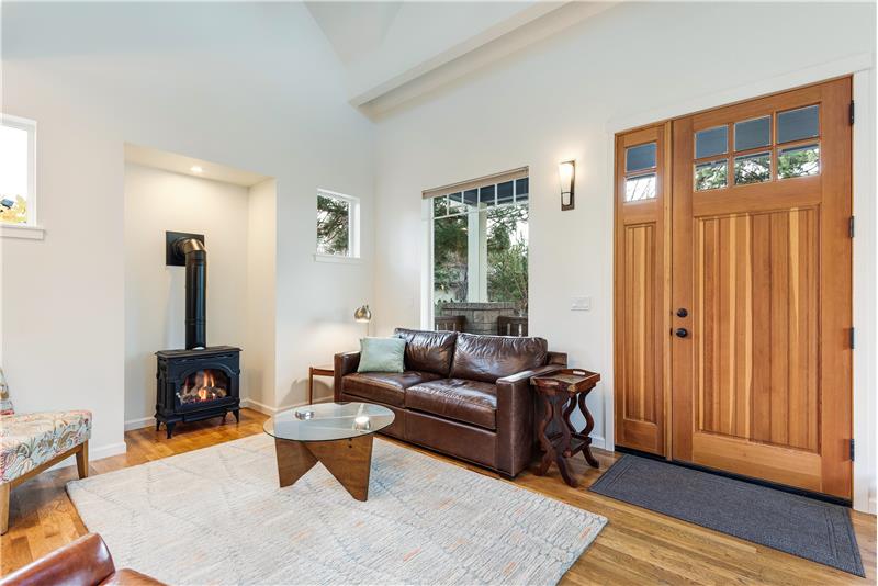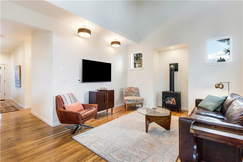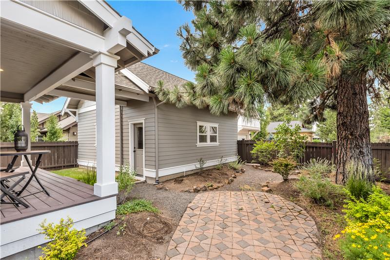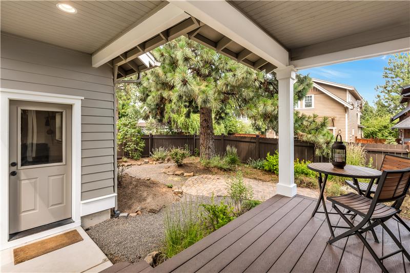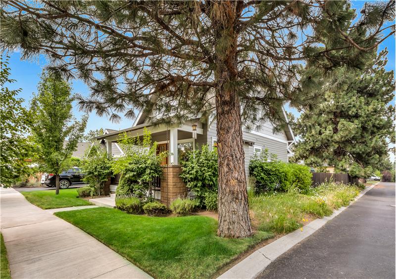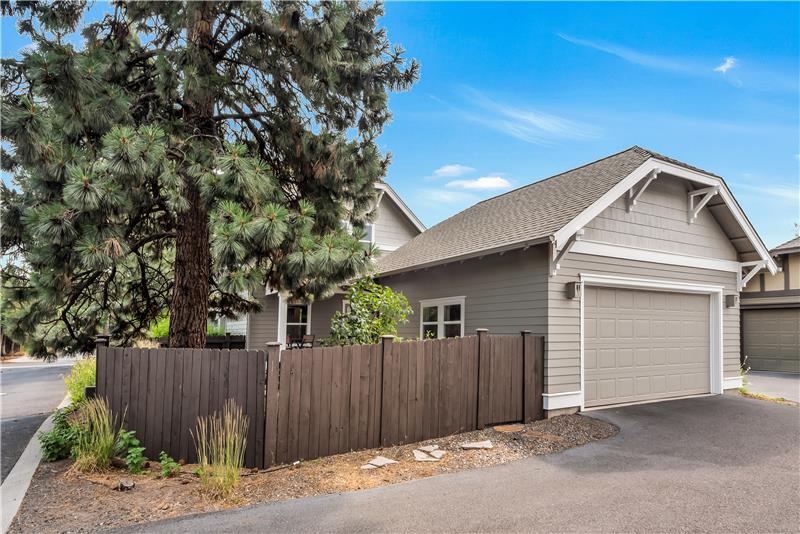 This well-maintained bungalow lives like a larger home with an airy, flexible floor plan filled with natural light. A covered front porch leads to a living area with vaulted ceilings, hardwood floors, a cozy gas stove, dining area, and kitchen with solid-surface counters and bar seating. The main level also has a guest room and full bath, and there is a quiet loft area upstairs, along with a new washer/dryer, and primary suite with a walk-in shower, water closet and walk-in closet. A covered breezeway connects the home to a 2-car garage encompassing a fenced backyard with old-growth trees.