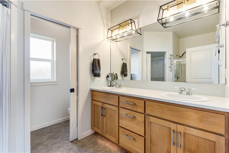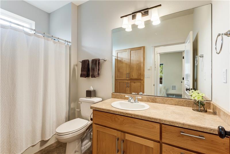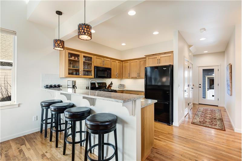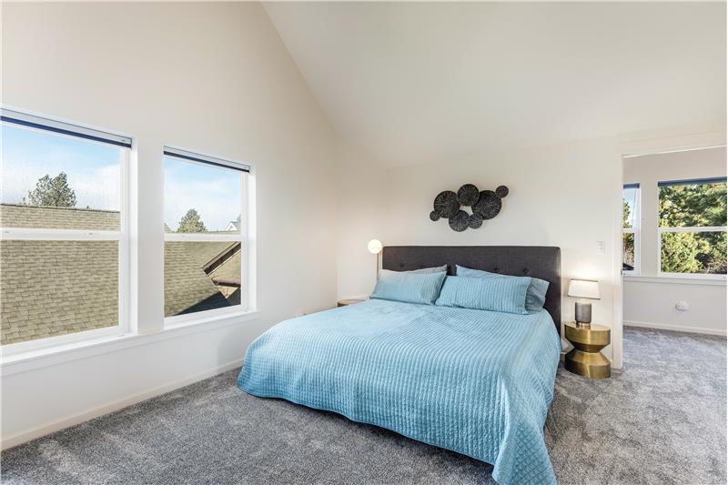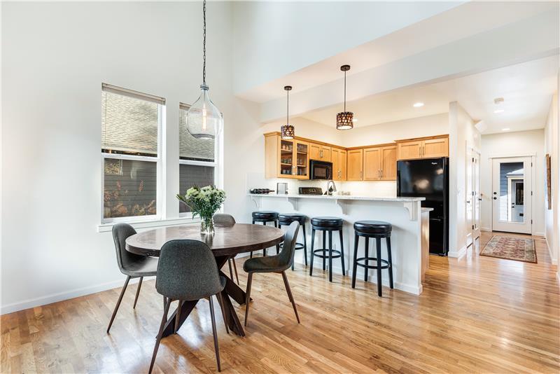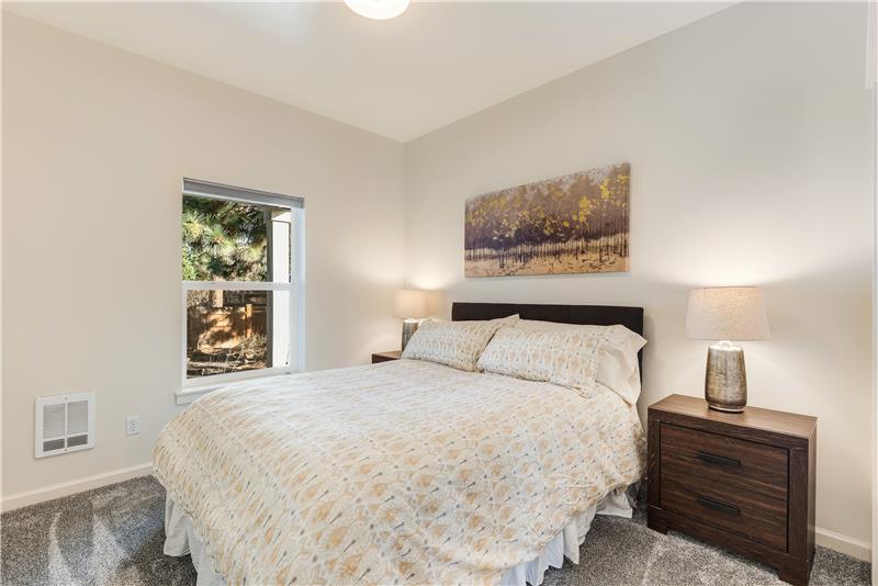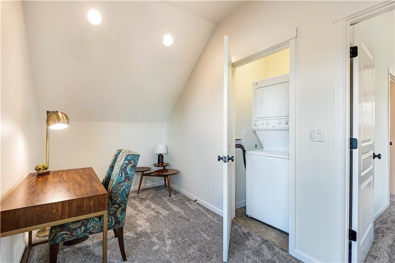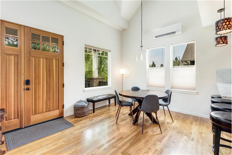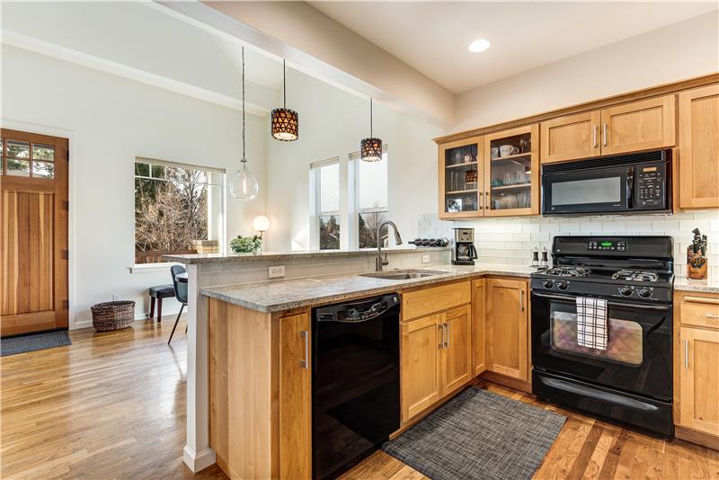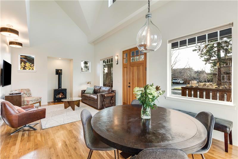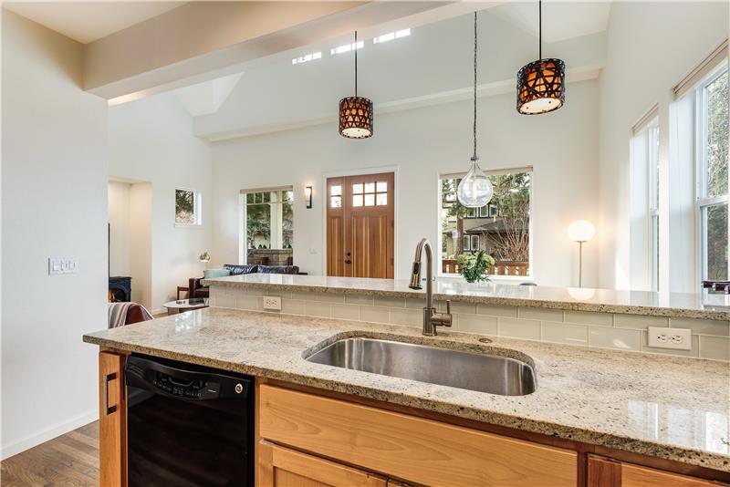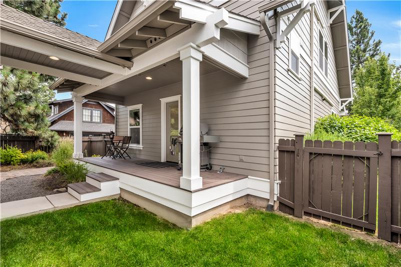 This well-maintained bungalow lives like a larger home with an airy, flexible floor plan filled with natural light. A covered front porch leads to a living area with vaulted ceilings, hardwood floors, a cozy gas stove, dining area, and kitchen with solid-surface counters and bar seating. The main level also has a guest room and full bath, and there is a quiet loft area upstairs, along with a new washer/dryer, and primary suite with a walk-in shower, water closet and walk-in closet. A covered breezeway connects the home to a 2-car garage encompassing a fenced backyard with old-growth trees.