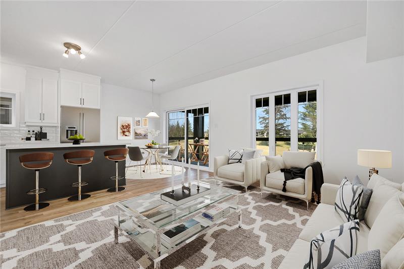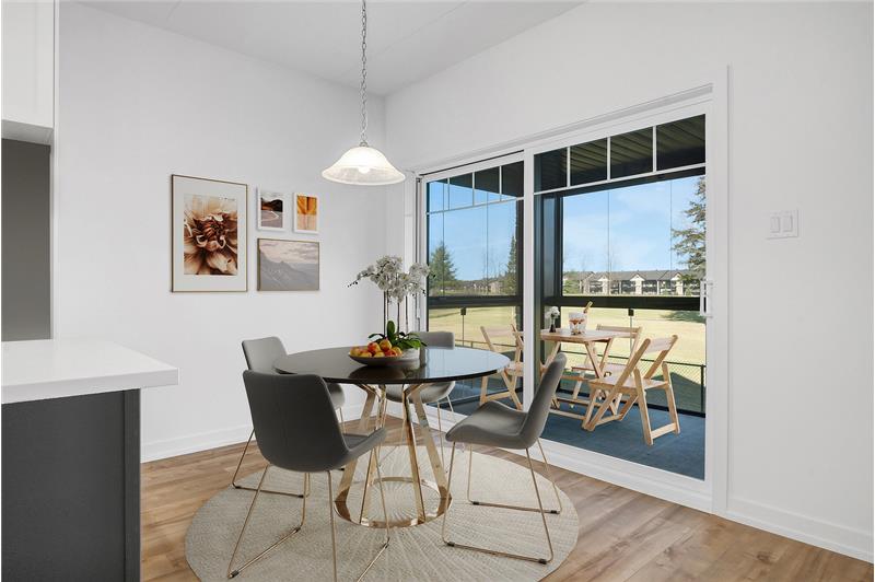 Upper-level 2-bed condo with modern luxury finishes, radiant heat floors, quiet concrete construction, and golf course views. Includes laundry, parking, storage, and upgrades. Approx. Winter 2026 occupancy.