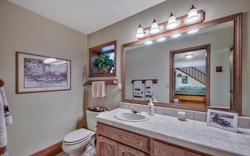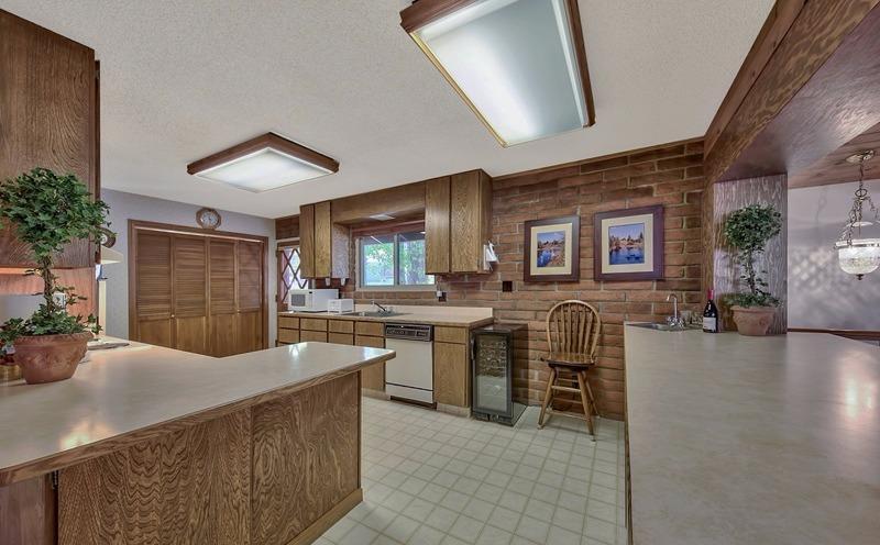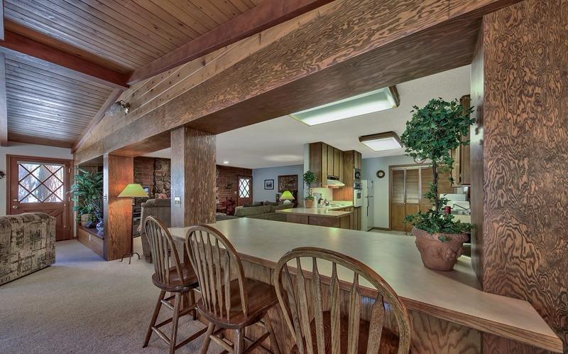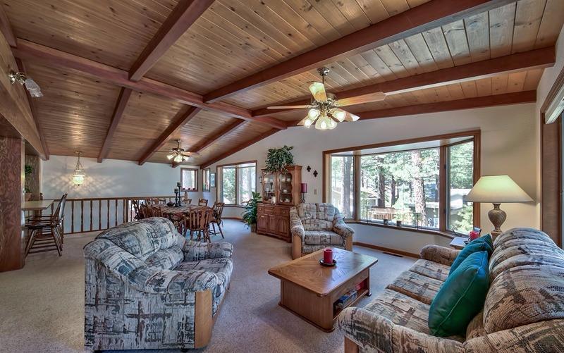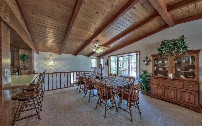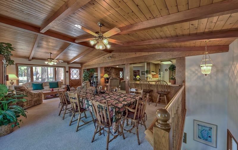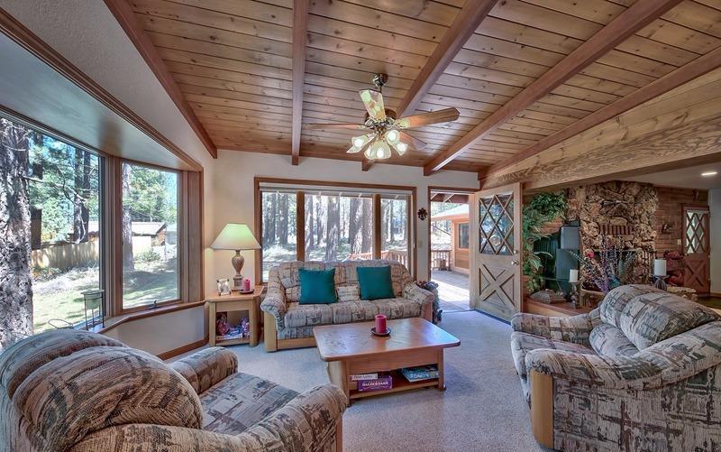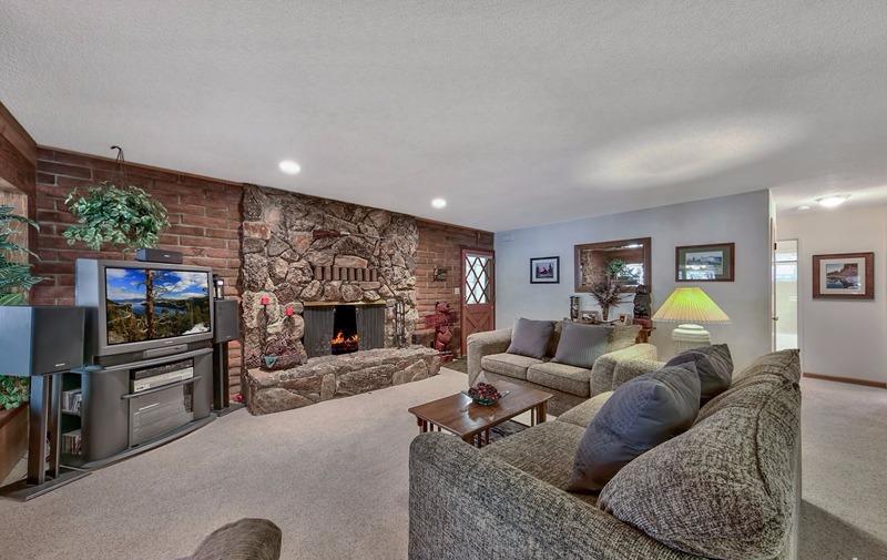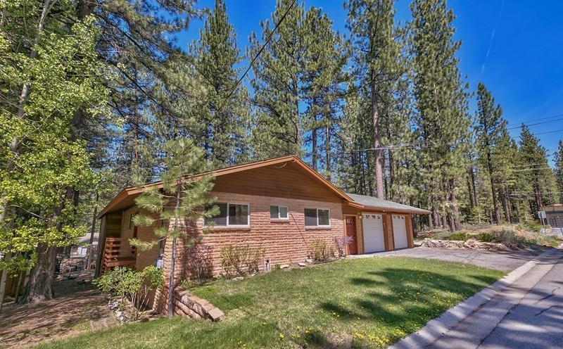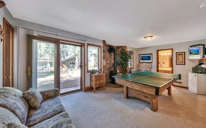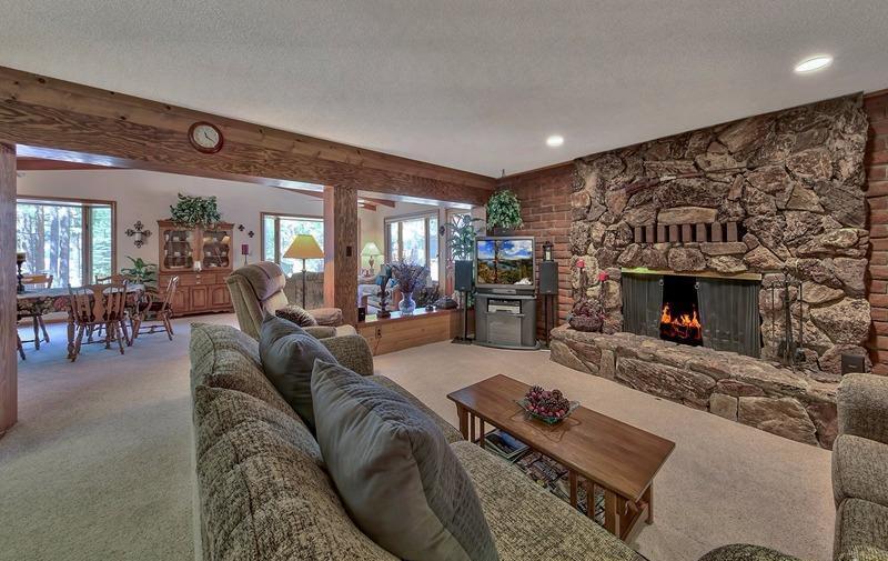 Rare double sized parcel is the park-like setting for this 2,269 square foot clean, warm and comfortable Montgomery Estates beauty. The entry level with two of the three bedrooms and the great room which features an open rock wood-burning fireplace, nice kitchen, eating bar, dining area and living room areas. Feels like home at Tahoe with the vaulted wood-beamed ceiling, big bay windows and access out to the spacious deck and huge side yard with horseshoe pit. Downstairs you are delighted to find a family room with bath, woodstove, lots of windows and a door out to the back-yard and a master b