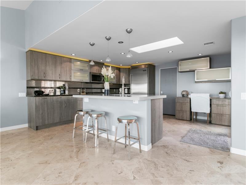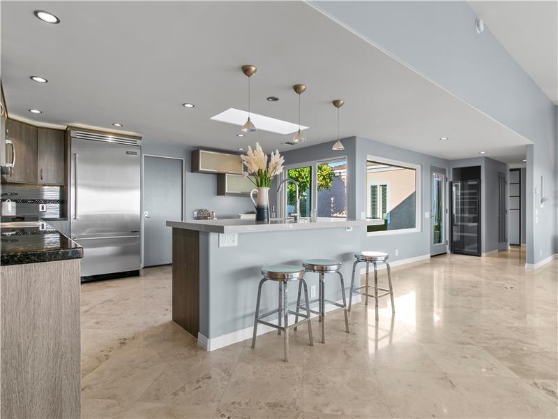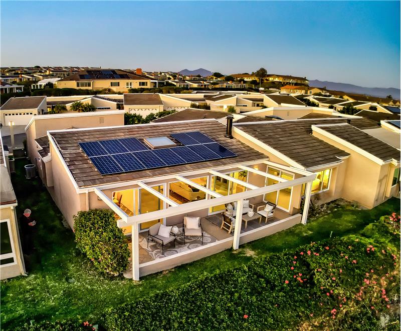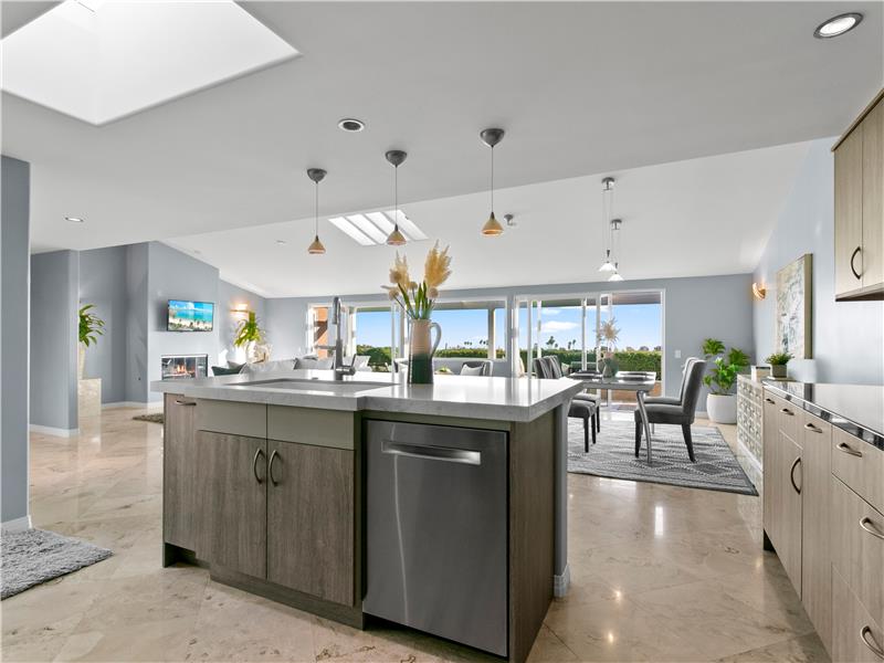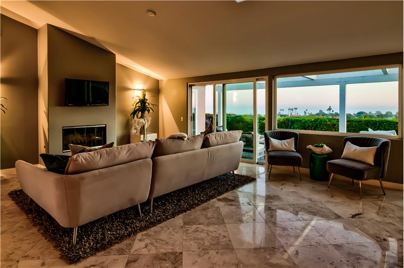 Unobstructed ocean views capture you in this home that blends modern upgrades, sustainability and luxury, offering you the finest in coastal living. As you step inside, the fully renovated interior with new carpet and new paint, whispers of understated elegance. The kitchen serves more than meals with heated floors, stainless steel appliances, a warming drawer, and a custom skylight that bathes the space in ambient light. The open-concept great room, featuring a cozy fireplace and an additional skylight, unfurls invitingly, offering a picture-perfect panorama of the glistening sea beyond.