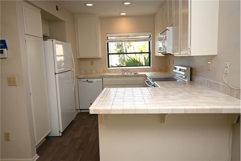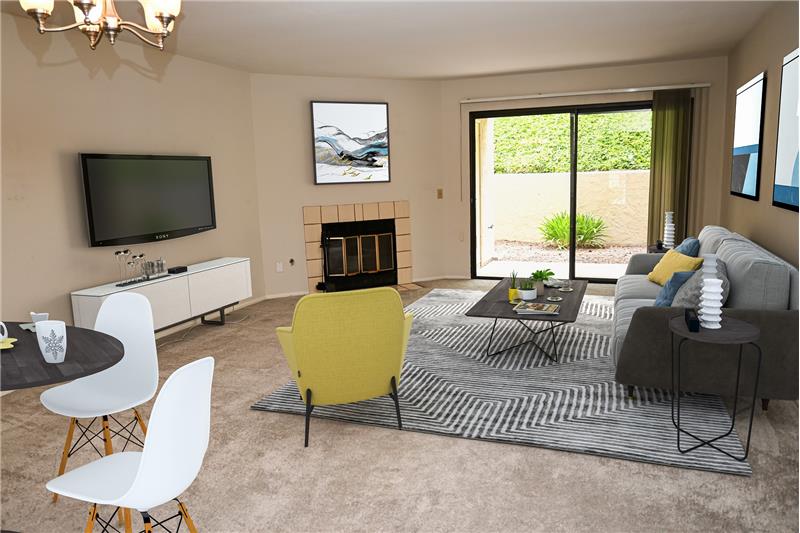 Easy living at Seapoint Tennis Club in La Costa. This spacious lower-level two-bedroom, two-bath condo offers hillside views and a spacious open floorplan perfect for relaxed coastal living. The inviting living room features a cozy fireplace and opens to a generous back patio with sliders and extra storage on both sides. The oversized primary suite easily accommodates a king-sized bed and dressers. It boasts a large walk-in closet and a dual-sink vanity in the en-suite bath. The second bedroom is also comfortably sized. The full-sized washer and dryer is provide. Enjoy the ease of a one-c