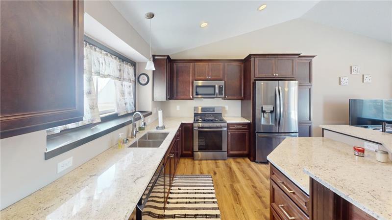 This newer constructed 2-bedroom, 2-bathroom home in Lindstrom features an open floor plan with a combined dining, kitchen, and living room area. The kitchen boasts granite countertops, a center island, manufactured hardwood floors, and stainless steel appliances, complemented by vaulted ceilings. Upstairs, the home offers two bedrooms, including a private primary bath with a tiled shower, as well as an additional half-bath and laundry facilities. The lower level is unfinished with a walkout to the backyard--leaving opportunity to finish off and expand your livable square footage/build equity!