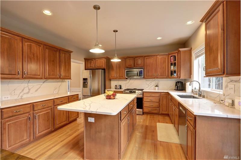 3030 sq. ft on a shy 1/4 acre cul-de-sac lot. Grand entry w/hardwood floors leading to a gourmet kitchen w/eating nook, bar w/new pendant lighting, newer quartz slab counters & 2 ft backsplash, S/S appliances, walk in pantry, and newer gas stove! Large formal living and dining rooms. Relaxing family room w/gas fireplace. Primary suite w/vaulted ceilings, large bath w/soaking tub, shower & huge walk in closet. Large & private fully fenced back yard w/extended patio, lush lawn & gardens. Raised garden bed, pear and apple trees, front and back sprinkler system & storage shed w/electricity.