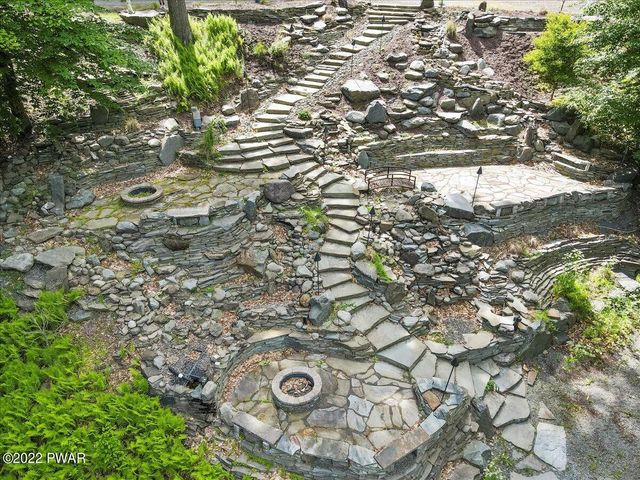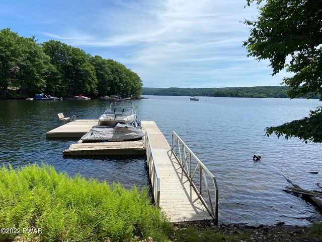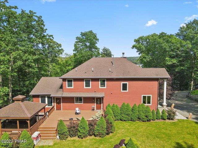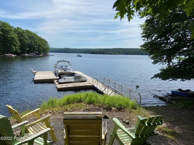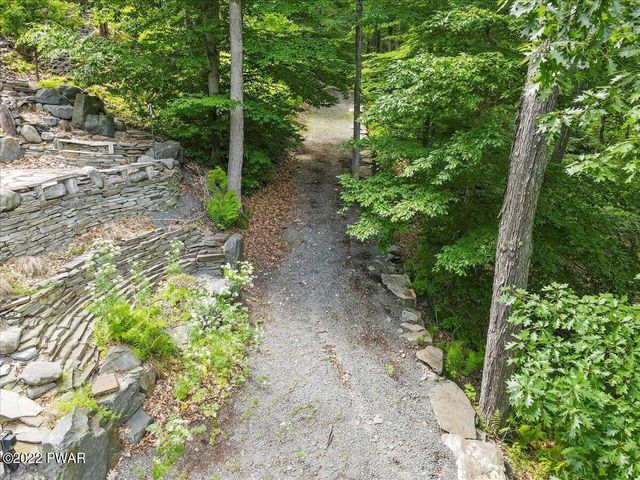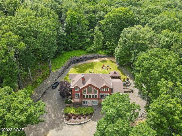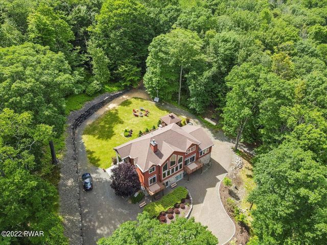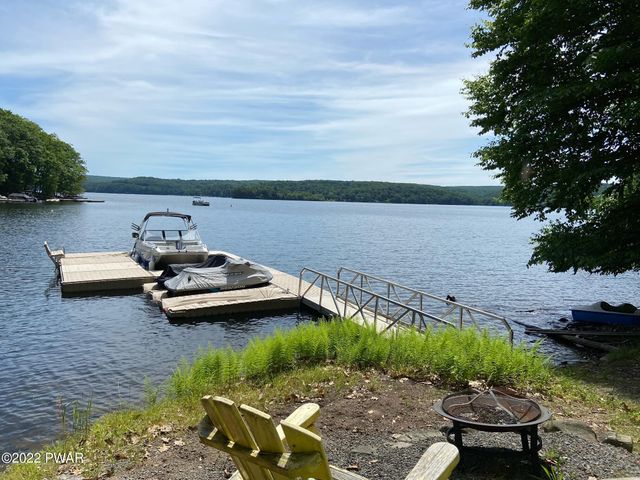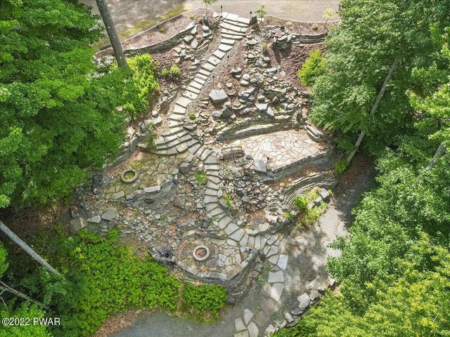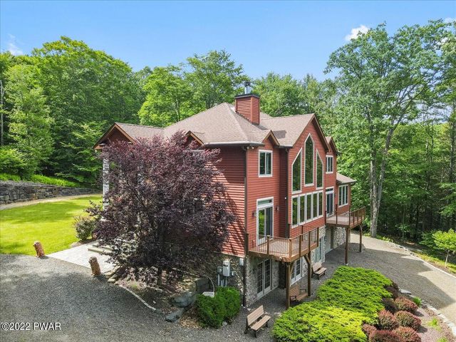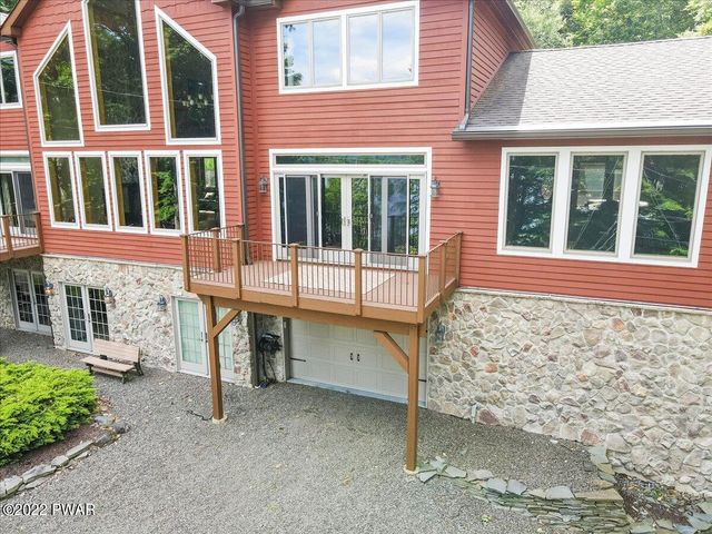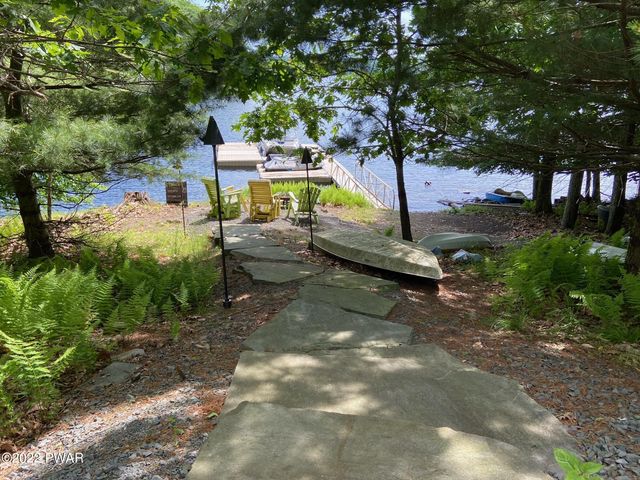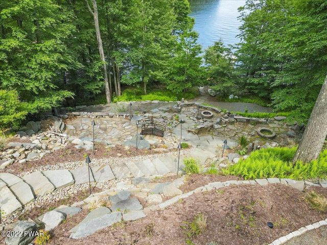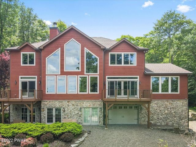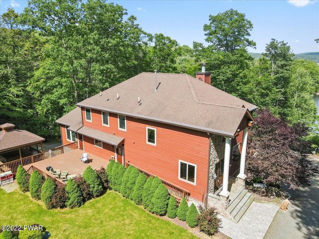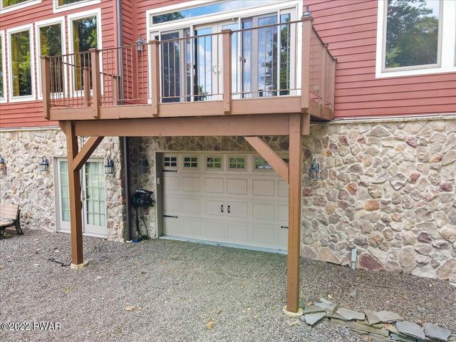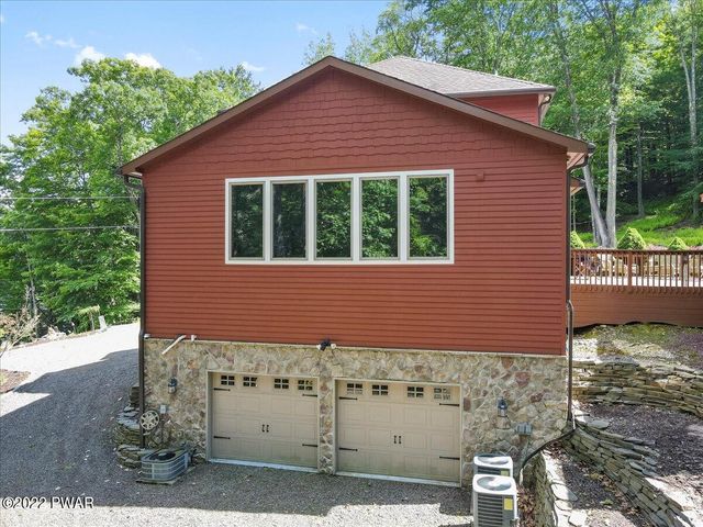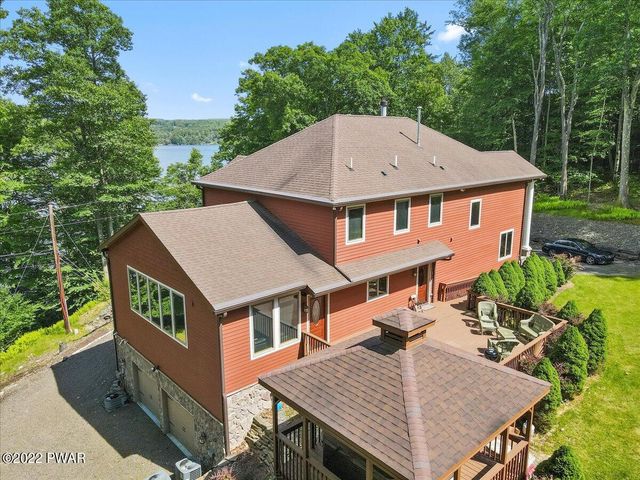 Custom built, Cedar sided LAKEFRONT home with long views of Lake Wallenpaupack from many rooms. Tremendous stone work graces the path down to lake with ponds, waterfalls and resting areas. Home sits on a huge lot with spacious backyard and features a deck with hot tub, multiple garages for your toys and seclusion from other homes. Drive down to lake with your golf cart or side by side, or walk the fantastic stone walkway. Behind the house is access to 350 wooded acres to explore.