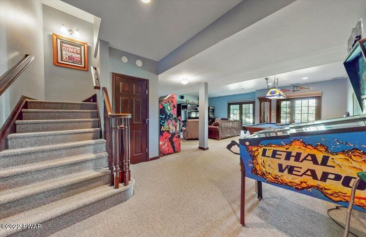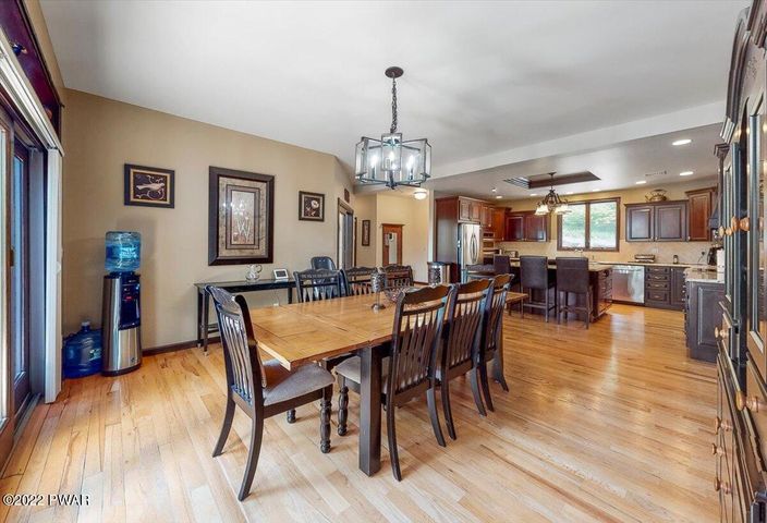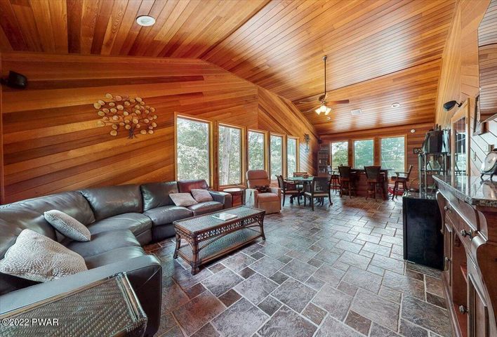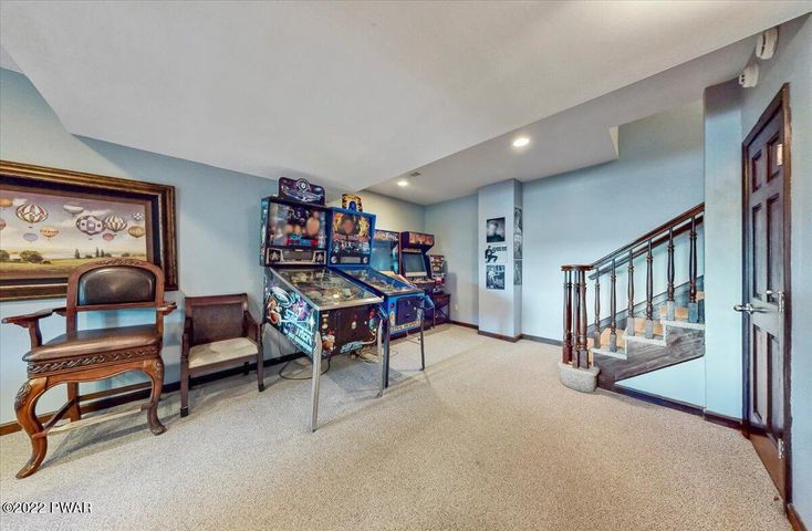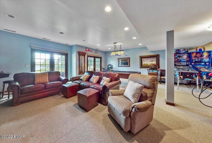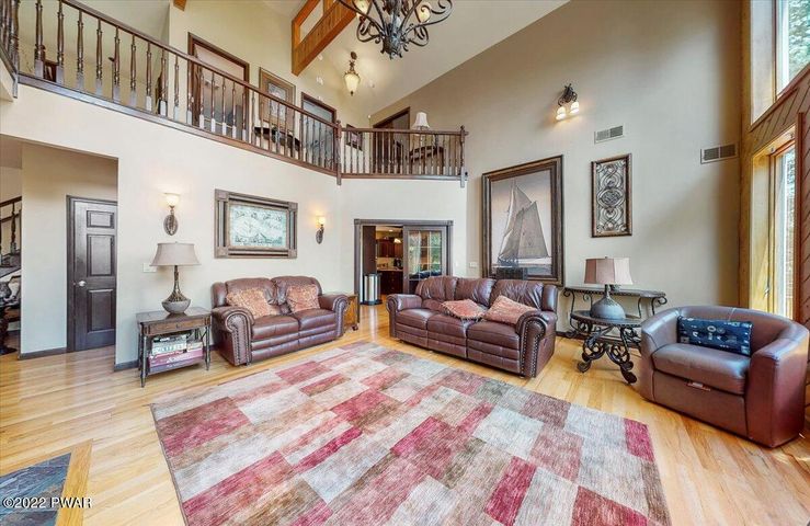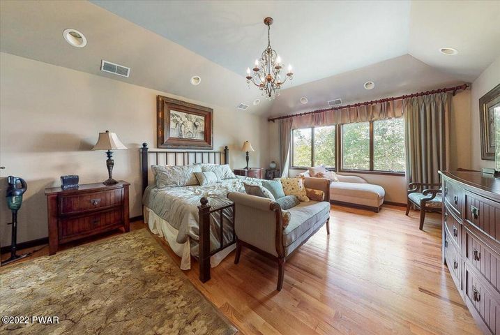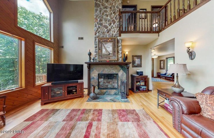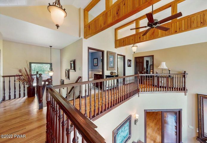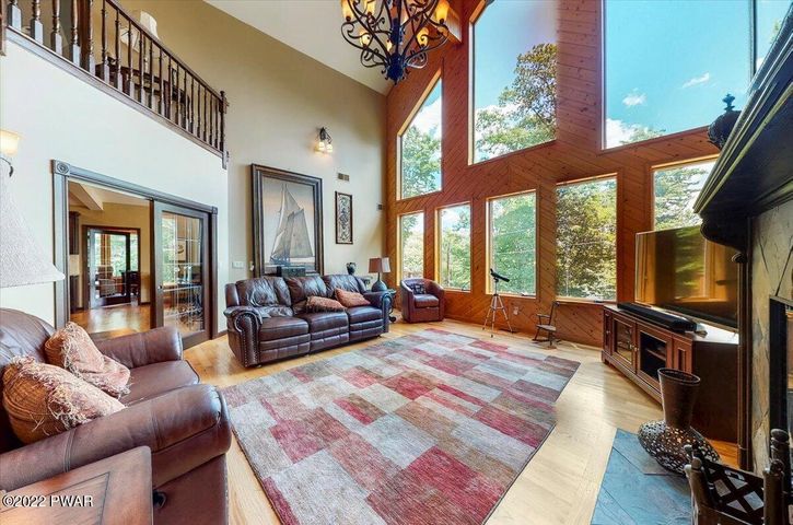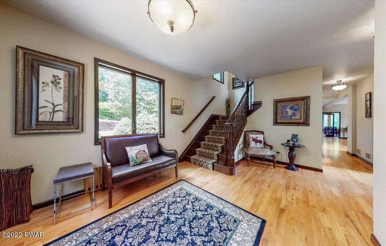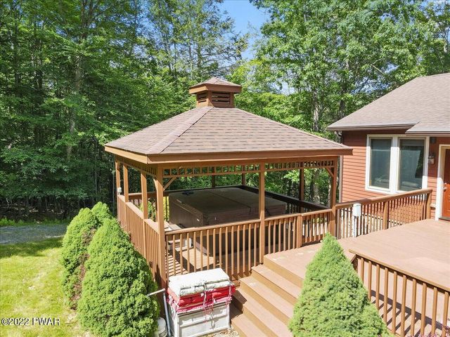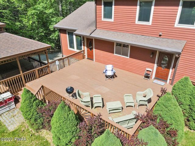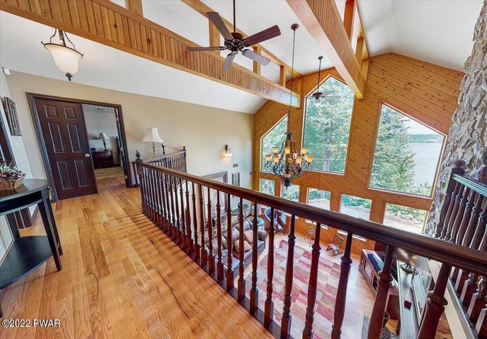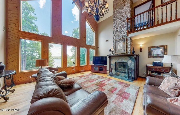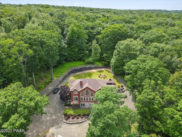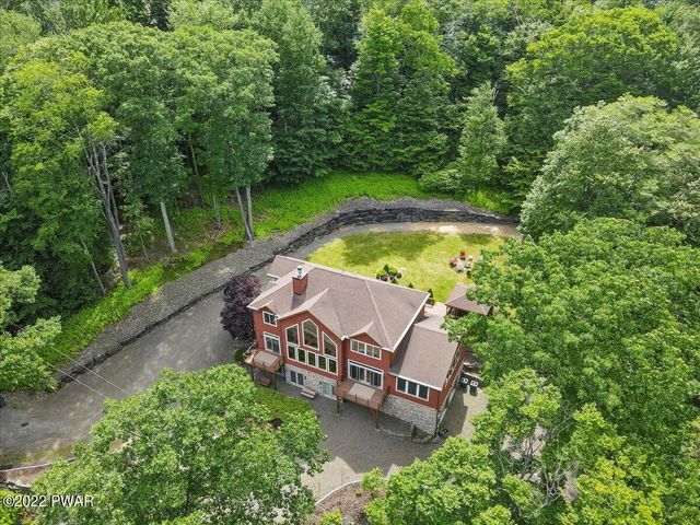 Custom built, Cedar sided LAKEFRONT home with long views of Lake Wallenpaupack from many rooms. Tremendous stone work graces the path down to lake with ponds, waterfalls and resting areas. Home sits on a huge lot with spacious backyard and features a deck with hot tub, multiple garages for your toys and seclusion from other homes. Drive down to lake with your golf cart or side by side, or walk the fantastic stone walkway. Behind the house is access to 350 wooded acres to explore.