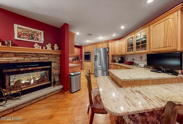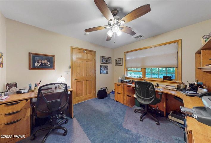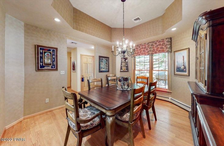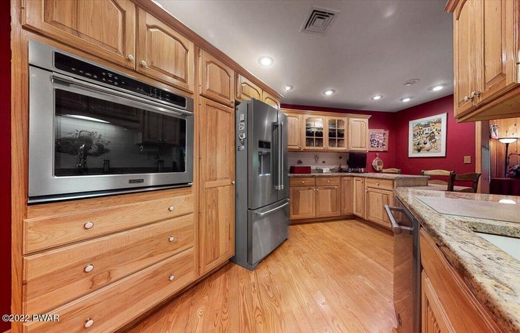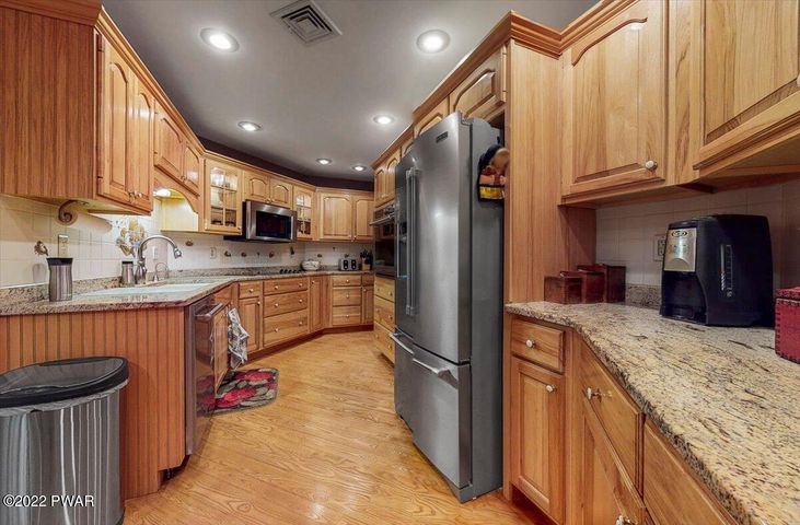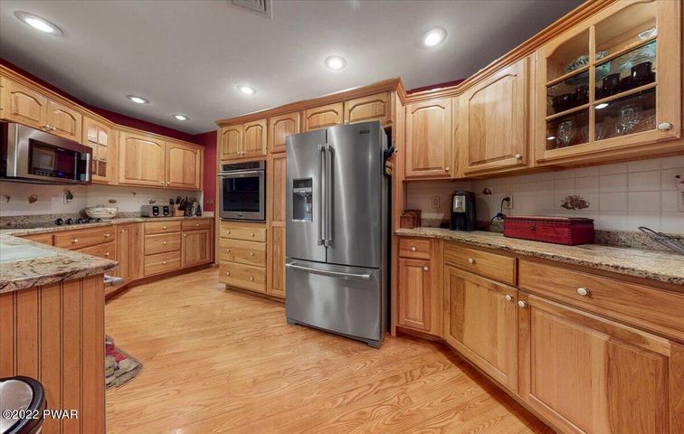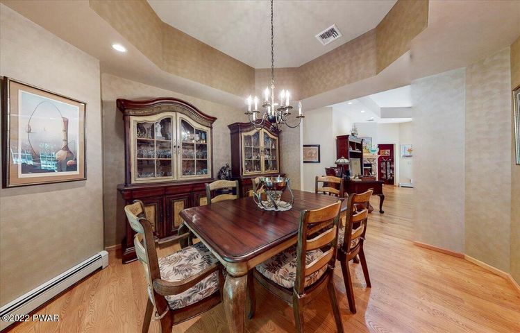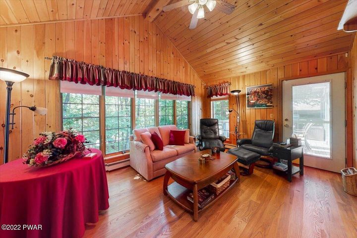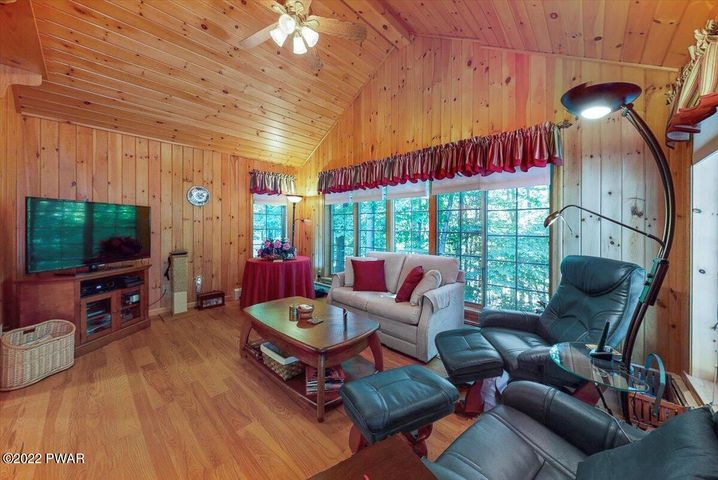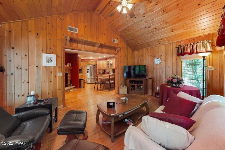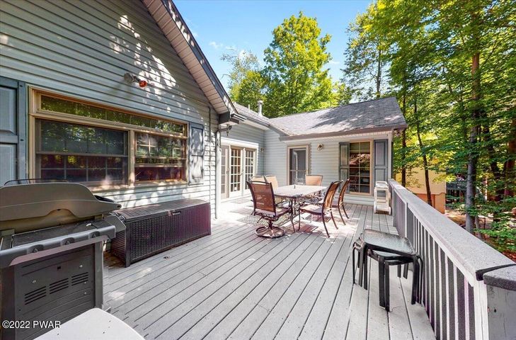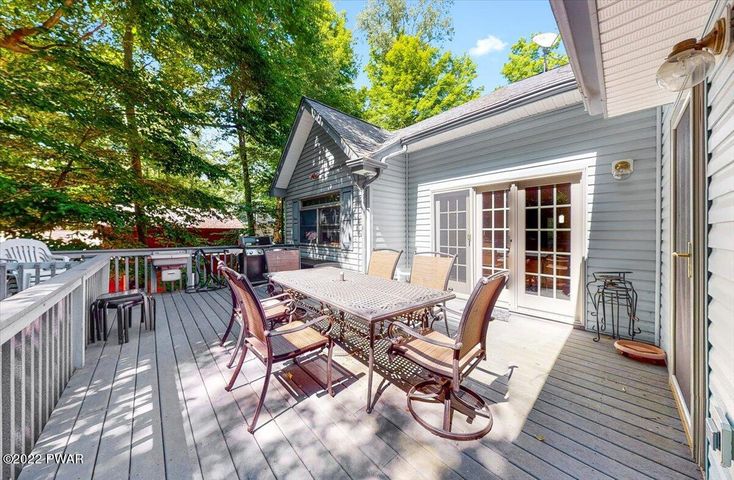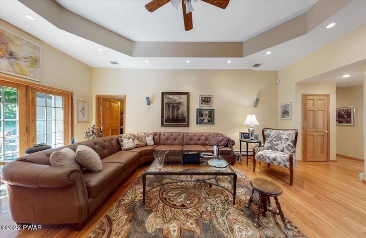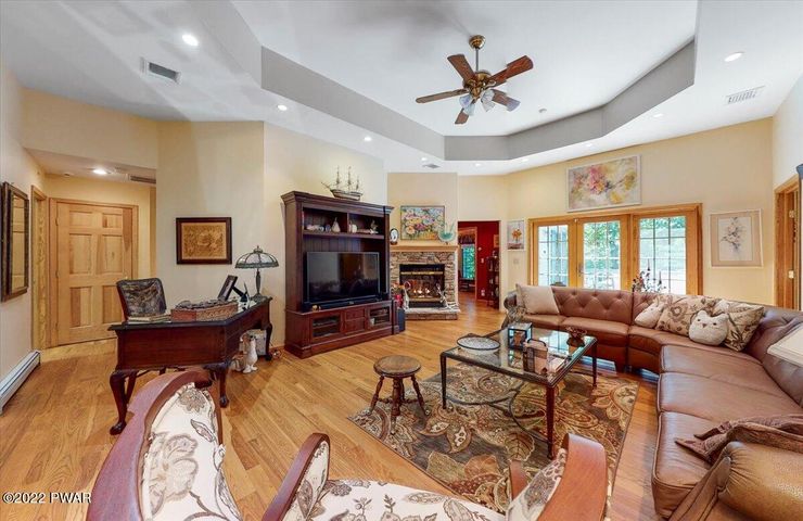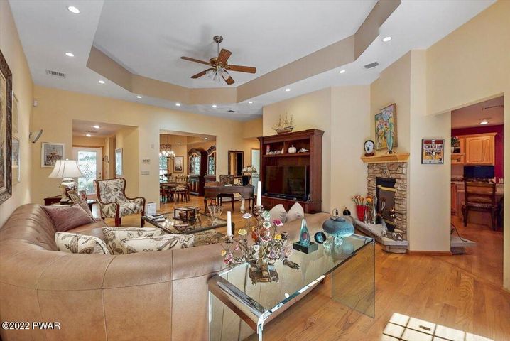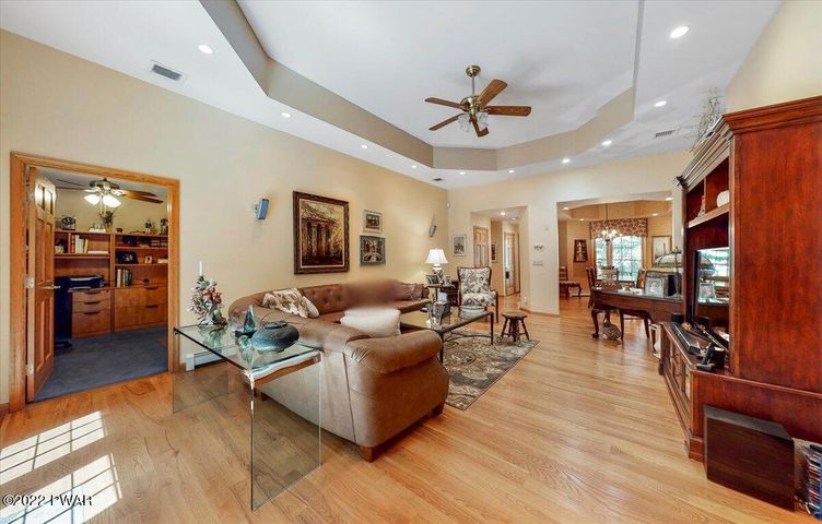 This fabulous custom Ranch home is nestled amongst the trees on a golf course fairway and tree lined cul-de-sac in The Hideout. It's wow factor living areas with hardwoods & tray ceilings are designed for every stage of life. The main level offers a split bedroom plan that includes office, primary suite and a living room with double sided fireplace, a formal dining area and super sun room with access to the sun/BBQ deck. Walk out lower level has expansive family room and lots of storage rooms. Paved drive, attached 2 car garage, central air and whole house generator top t off!