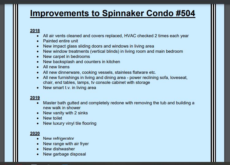 PLEASE read ALL of the REMODELING and UPGRADES that have been done to this unit, because it far surpasses all others. You will find the upgrades in the associated documents section of the listing, and also in one of the photos. Now, let's talk about: The Spinnaker: DIRECTOCEANFRONT Condominium Building is located in the highly sought after area: 3513 S. Ocean Blvd. in The Windy Hill Section of North Myrtle Beach. 5th Floor with spectacular views.