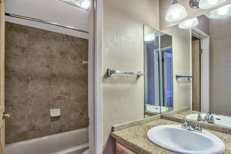 The deck is the largest one built and triple the size of the homes on the market. There is plenty of outdoor space to park your bikes/toys. The kitchen is upgraded with hickory cabinets, granite counter, new flat top range and a huge buter block table. The bath has granite counters and a designer tile tub shower combo. The doors are solid wood panel and the closets have mirrored sliding doors. There is a new gas free standing fireplace with hearth. The windows are double pane. Newer carpet and tile floors. Enjoy views of the year round heated pool and spa as well as the new bike trail and Heav