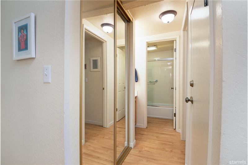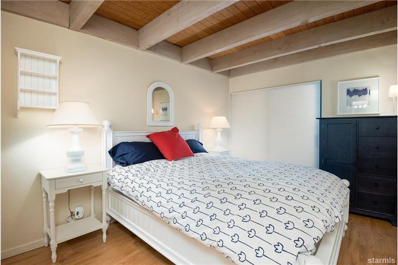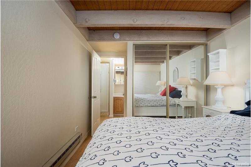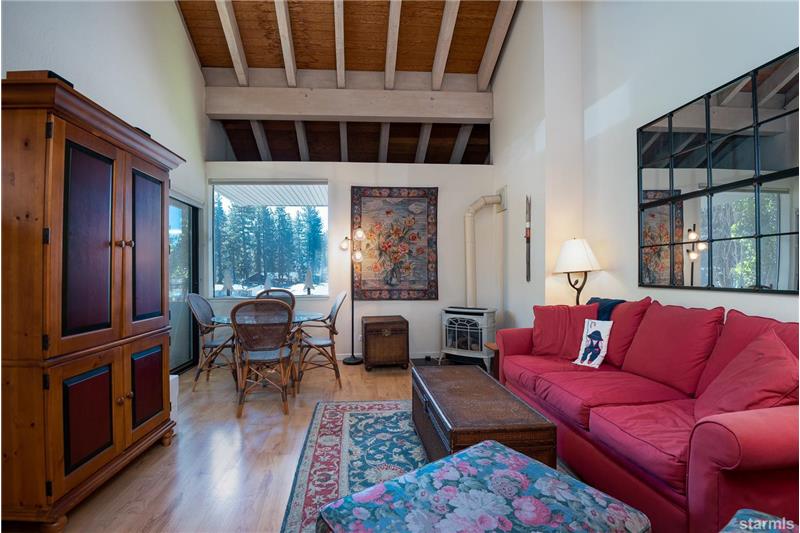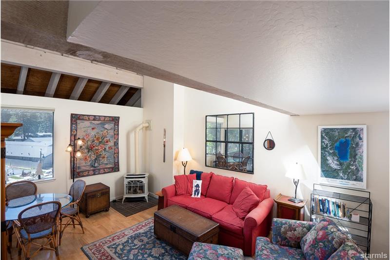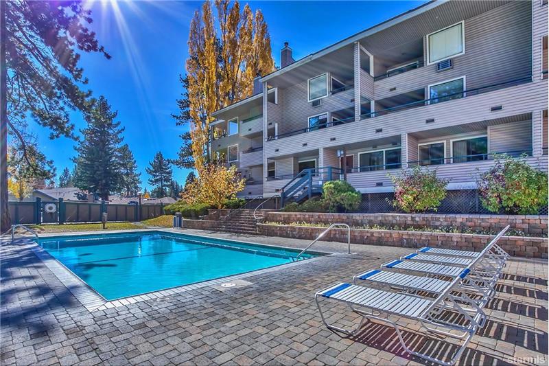 Waterfront 19 acre community located in the tourist core where short term vacation rentals are permitted! This top floor end unit fully furnished condo has been meticulously maintained as a private home for 22 years. Enjoy tree top views of Heavenly Valley Ski Resort and the year round heated pool and spa. Beautifully upgraded with solid surface flooring throughout the first level open beam vaulted ceilings, 2 skylights and a high quality cast iron enamel fireplace. The loft (*2nd bedroom) has a half bath, Berber carpet, large closet, ceiling fan and vaulted ceilings.