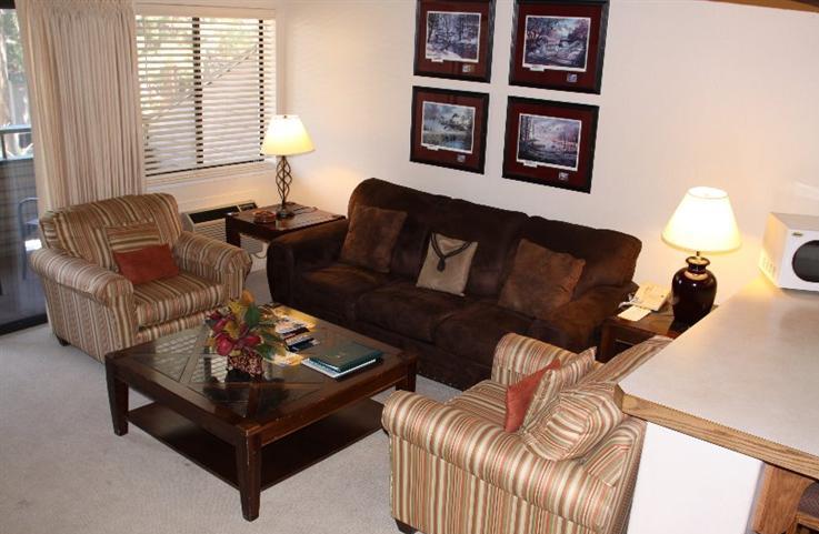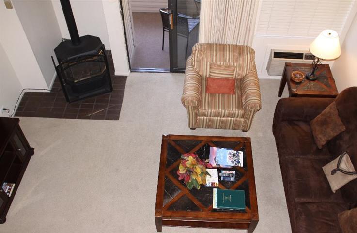 Lake view top floor condo in Lakeland Village. Enjoy sunsets over the lake from the covered deck. This is a fully furnished turn key studio loft that is on the quiet side of the building. There are open bean vaulted ceilings, breakfast bar, new plush carpet and more. Located in the same building is underground parking with elevator access, fitness center, 2 saunas,year round heated pool and spa and a beautiful lobby with a large stone fireplace. Hurry opportunities like this don't last long!