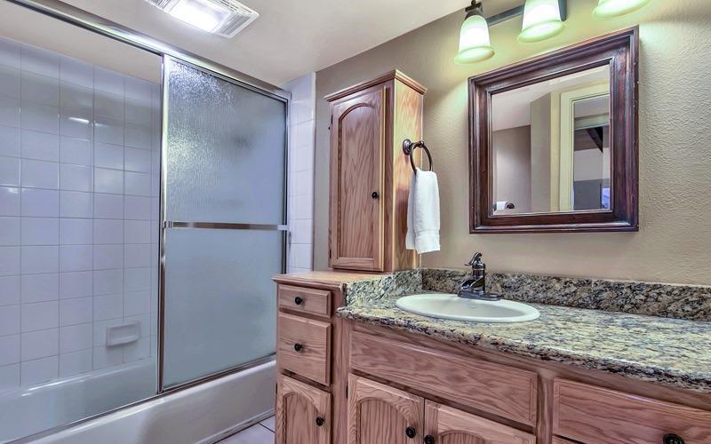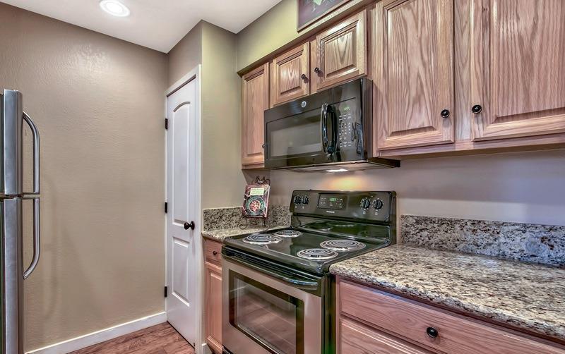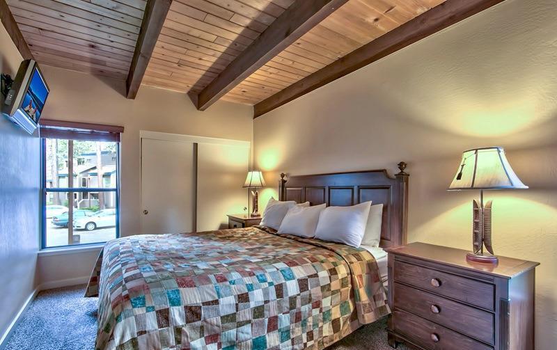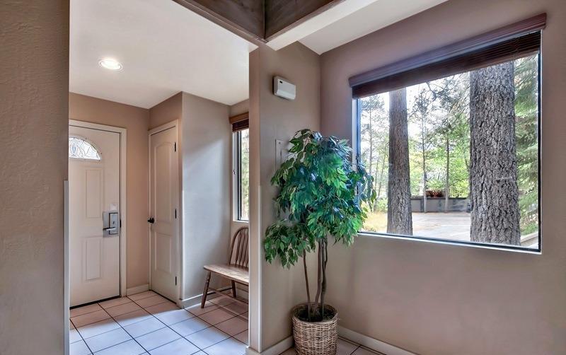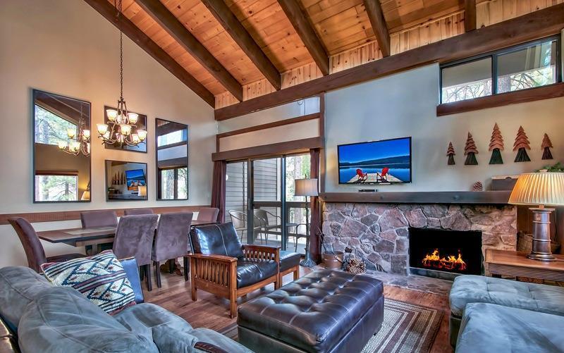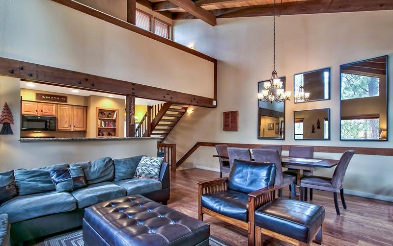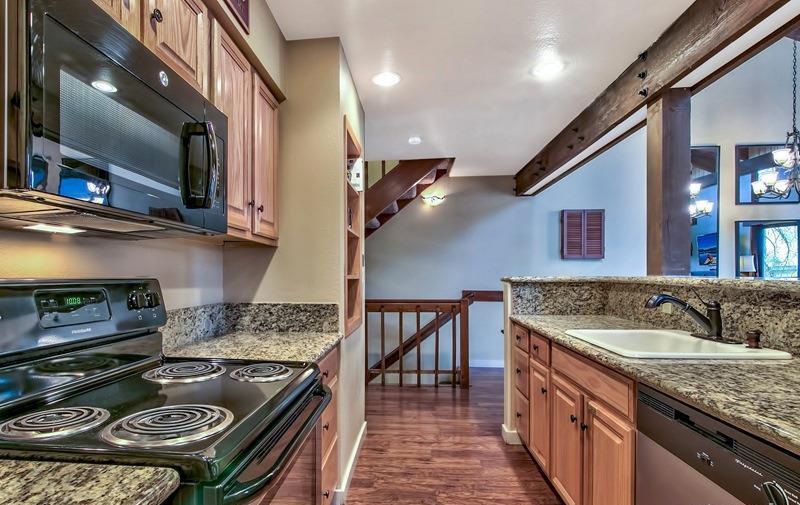The beach and tennis courts are just a 30 second stroll away from this highly upgraded Lakeland Village townhouse. The floor to ceiling windows let in lots of light and beautiful views of the surrounding pine trees. The front porch has been enclosed to add more room in the foyer. The great room area has solid surface flooring throughout and vaulted open beam ceilings. There is a large stone fireplace with gas logs. The kitchen has upgraded cabinets, granite counters, a large pantry, stainless steel appliance, recessed lights, breakfast bar and built in shelf for all your cookbooks.