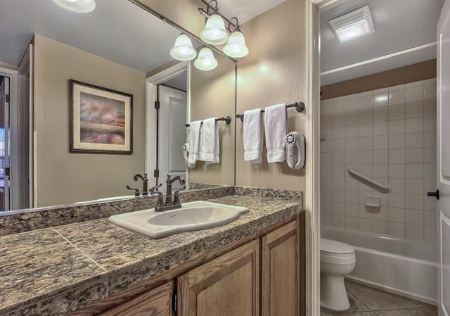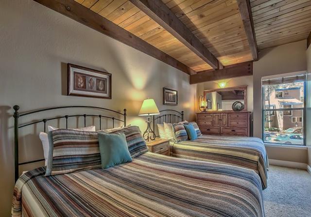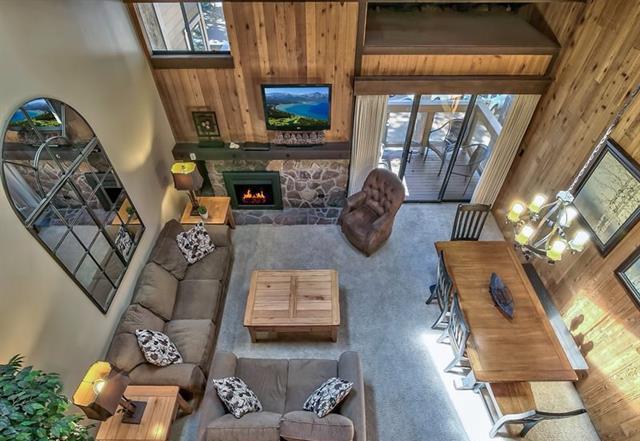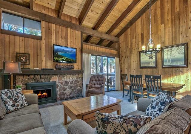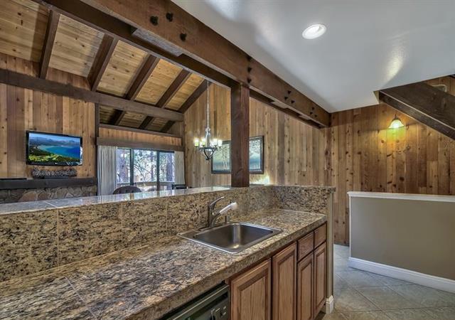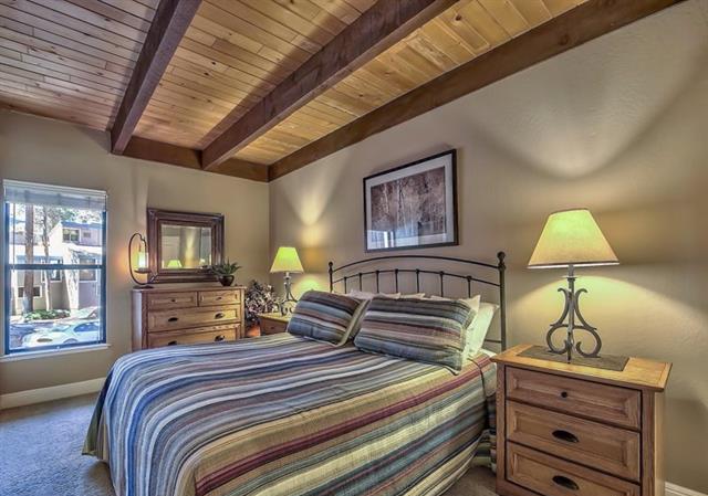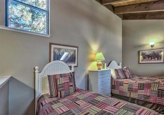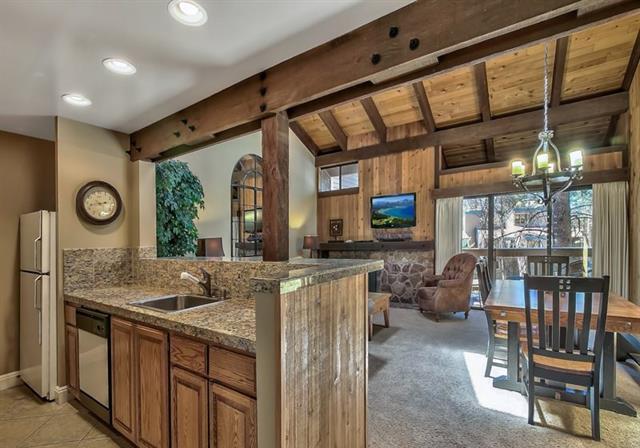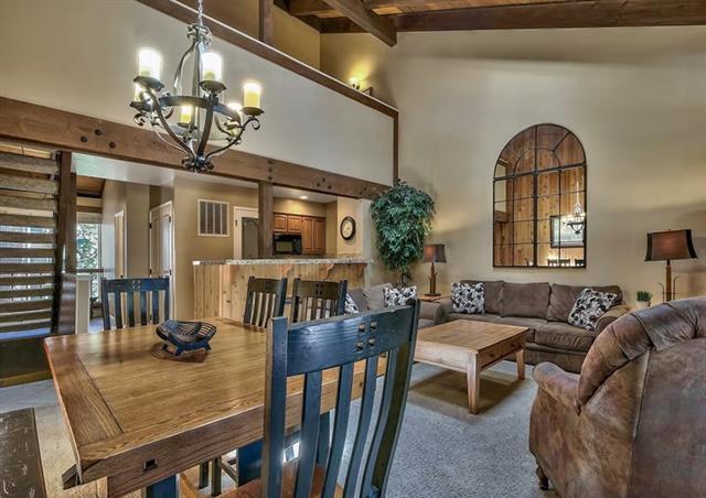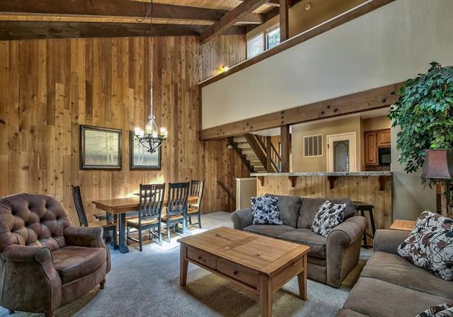 This 2 bedroom with loft as the 3rd comes completely furnished including the accessories and electronics. The kitchen is upgraded with granite tile counters and breakfast bar, tile floors and it has a large pantry with a glass door. The main bathroom has tile floors and granite tile counters with separation between the vanity and water closet. The upstairs bath is very spacious with a tile stall shower. The living/dining room has a sliding glass door that opens to a covered balcony and includes a large stone fire place with gas insert & vaulted open beam ceilings with 2 skylights.
