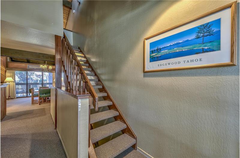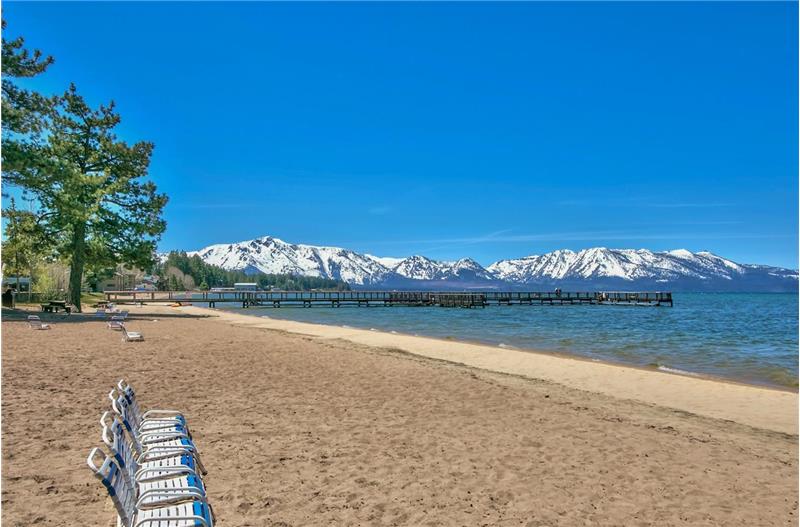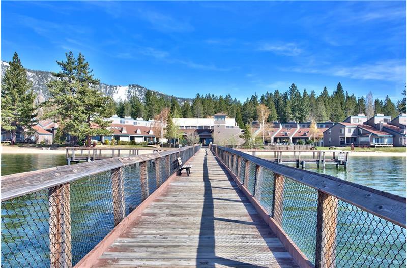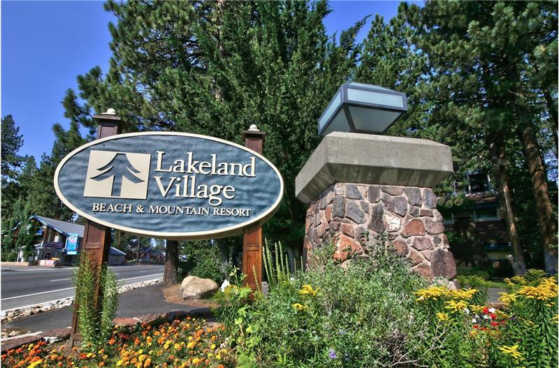 Waterfront community located in the tourist core. Lakeland Village borders 1000' of sandy beach and has a private homeowners association pier. This two bedroom with the loft(3rd bedroom) townhouse has a full bath on levels one and two. The covered balcony overlooks a wide open greenbelt landscaped with lawn and towering Jeffery Pines. The front porch overlooks more trees, lawn and a park.This home has been upgraded with granite slab counters, designer tile showers and it comes fully furnished. Vacation rental permits are available so that you can continue with the successful rental program.