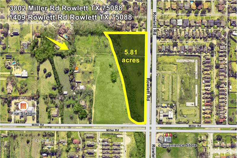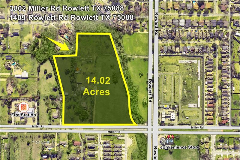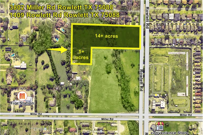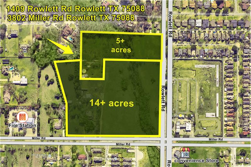 Excellent Location to Develop & Build Homes in Rowlett, Texas. Perfect for a Residential Subdivision with a Retail Center or Freestanding Commercial Pad Sites. Entire 20 Acres can be sold with 3802 Miller Rd (14.44 acres) & 1409 Rowlett Rd (5.57 acres) or can be Divided. There is an existing 2886 SF Structure here and All is to be sold for Land Value. This Land is currently being used as a Horse Ranch. There is a Small Portion of the Creek Area closer to Rowlett Rd. New Housing Development across the street. Less than a mile from George Bush Freeway and the Downtown Rowlett area.