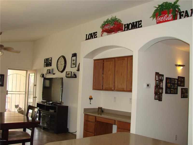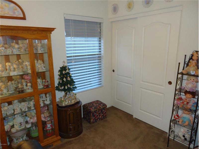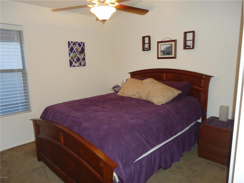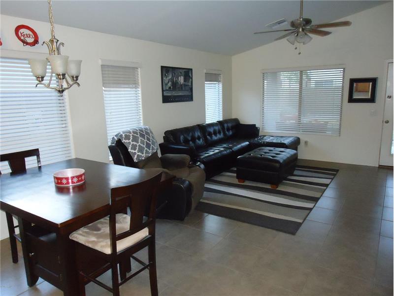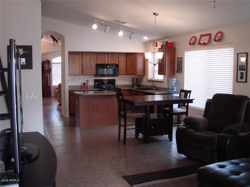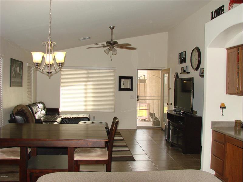 Homestead north in north edge of Maricopa has playgrounds plus community lake and The Duke golf Course close by. Single level with vaulted ceilings. All appliances stay. Tile floor in all social areas and bedrooms have new carpet. Sun screens, fans, and new AC for low electric bills. Covered patio with grassy area in back. 2-car garage. Low HOA fees.