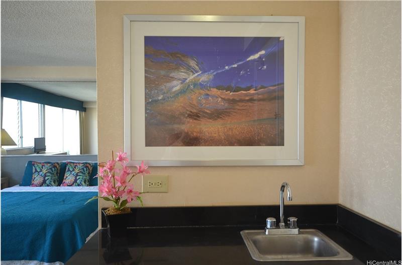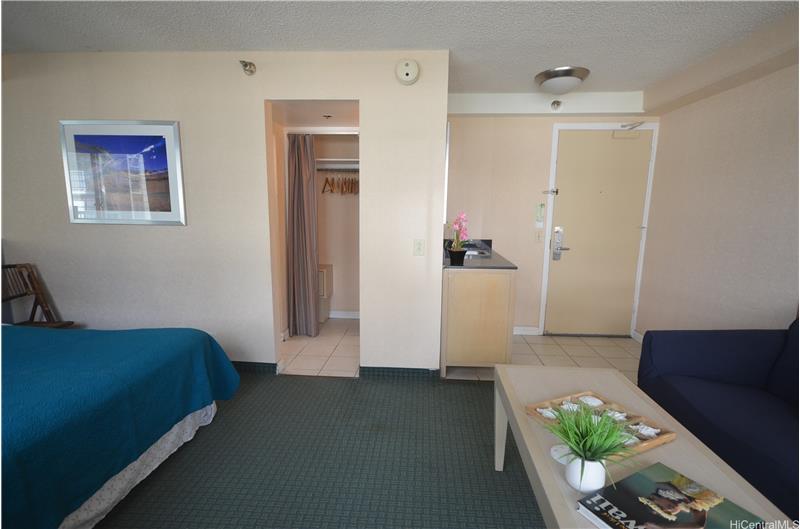 Fee-simple studio in Aloha Surf Hotel, Waikiki. Spacious 9th-floor unit with kitchenette, sleeps 4. No NUC/STR permit needed. Sold AS IS—bathroom needs renovation. Hotel-style amenities: pool, BBQ, lobby, ice machine, laundry. Video security, on-site staff. Limited guest parking after 4pm. Maintenance fee includes electric, cable, internet, water, sewer, trash. Vacant and easy to show. Priced below tax assessed value—ideal for personal use or rental income.