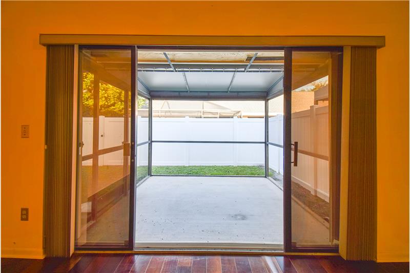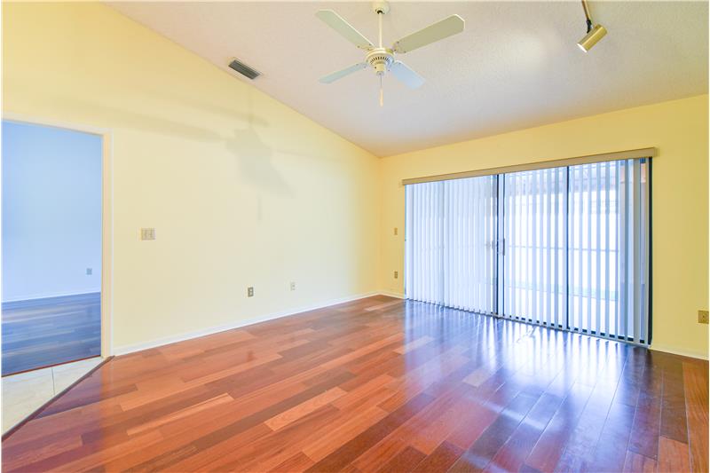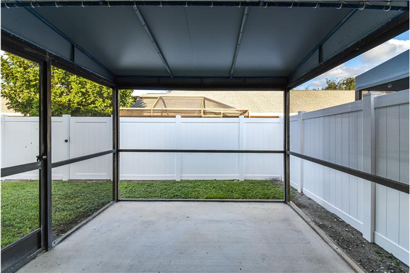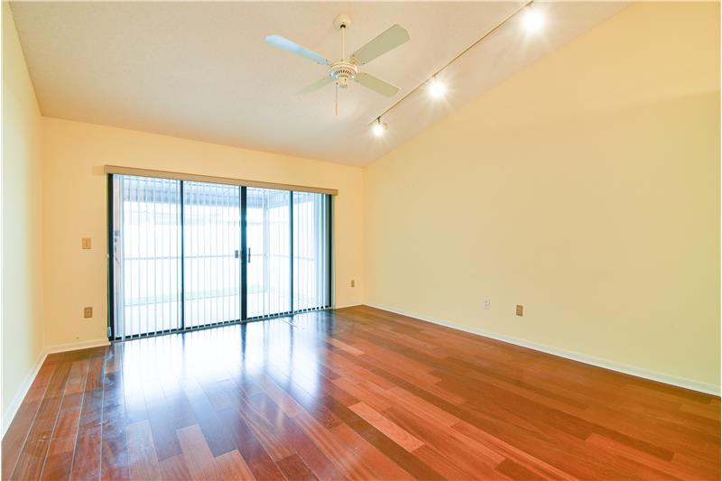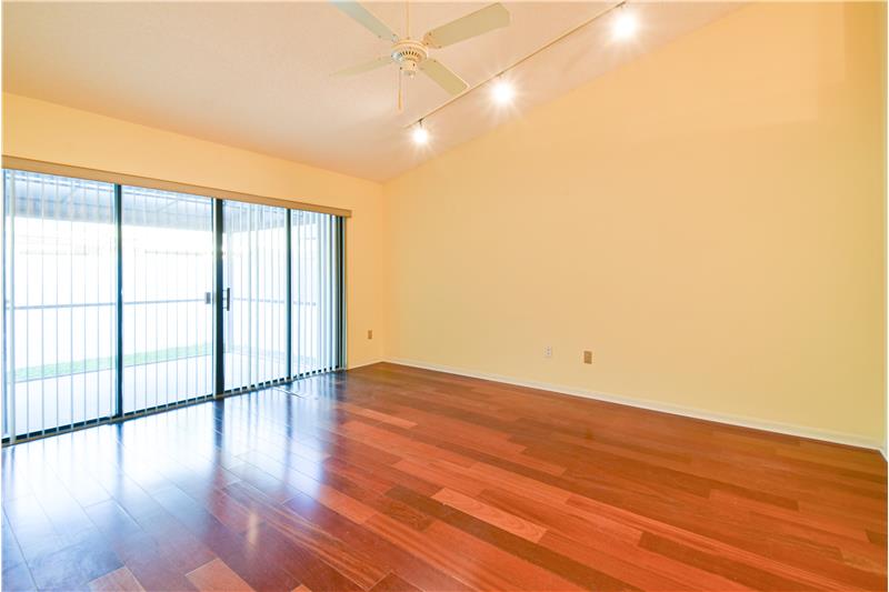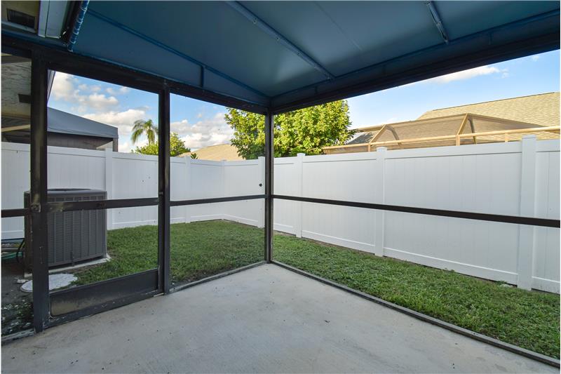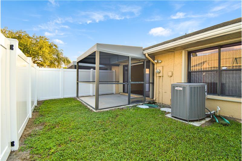 Spacious and Bright Single Story Villa with a split floorplan that has 2 bedrooms and 2 full baths. This home features cathedral ceilings, updated guest bath and a remodeled kitchen with granite counters, solid wood cabinets with crown molding and stainless appliances. It also includes a garage, wood and tile flooring, covered and screen enclosed patio, fenced back yard and accordion shutters for full storm protection.