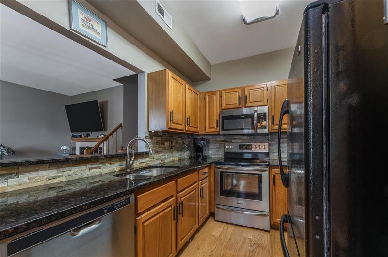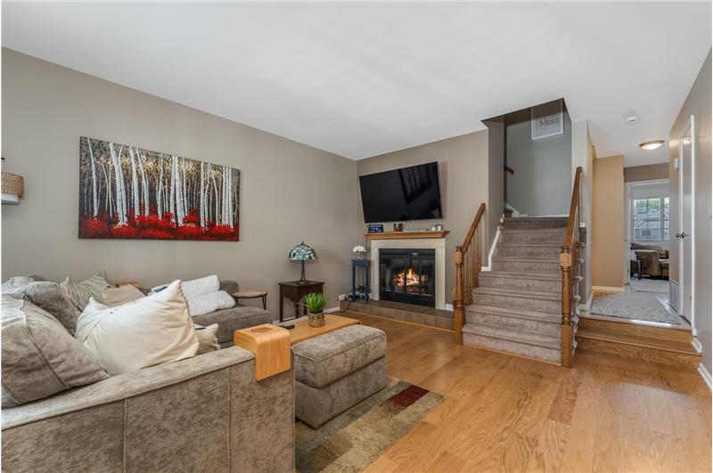 Convenient location in desirable Crestmont section of The Hills, move right in and enjoy this 2 BR/2 BA with a great floorplan and attached garage. Private, covered patio for outdoor relaxation. Living room has a wood burning fireplace. Dining room with bay window. Wood floors on main level. Updated kitchen features SS appliances, granite counters, stacked stone backsplash, and a pass-through opening. Office or second bedroom on main floor, full bathroom. Primary bedroom is on the second level, with a vaulted ceiling, renovated ensuite bathroom, and generous closets.