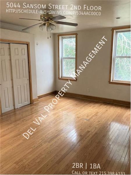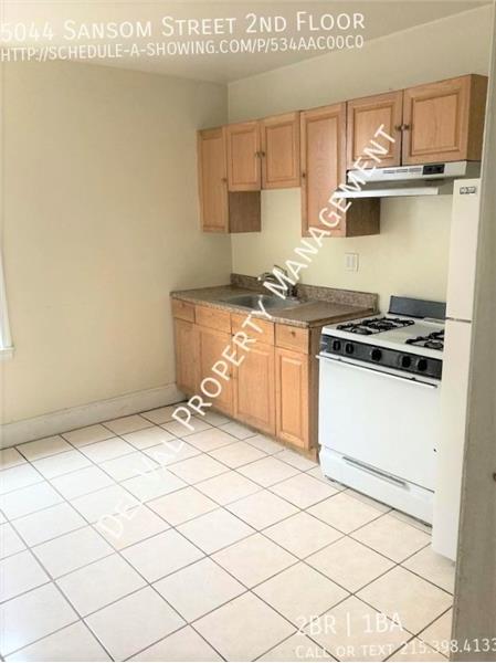 • Roomy 2nd FL Apartment for Rent in Renovated Duplex– 5044 Sansom Street, Philadelphia – Available Now in West Philadelphia • $915 / month plus utilities • 2 Bedrooms • 1 Bathroom • Eat-in Kitchen comes equipped with gas stove, refrigerator & range hood – attractive wood cabinets & NEW tile floor, too! • Hardwood floors, energy-efficient ceiling fans & large closets in bedrooms • Walking distance to public transportation, laundromat, shops and eateries • For More Information or a Showing, please see Description Page!