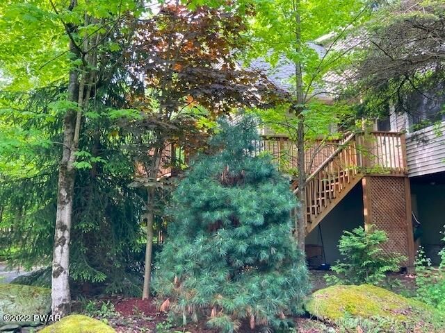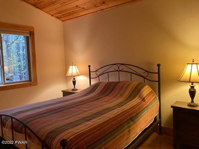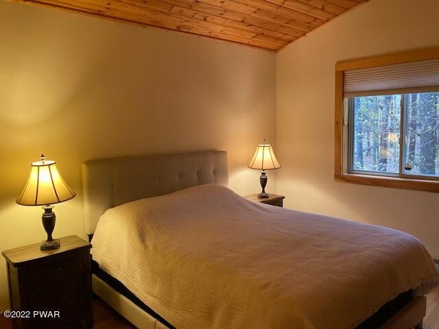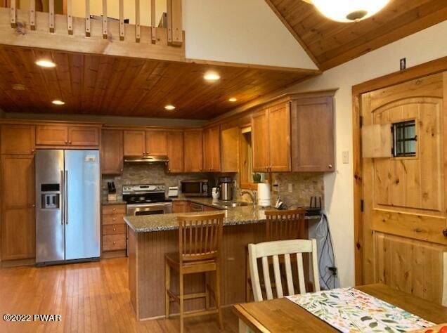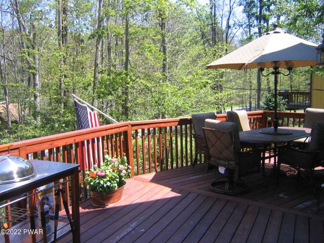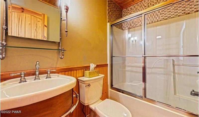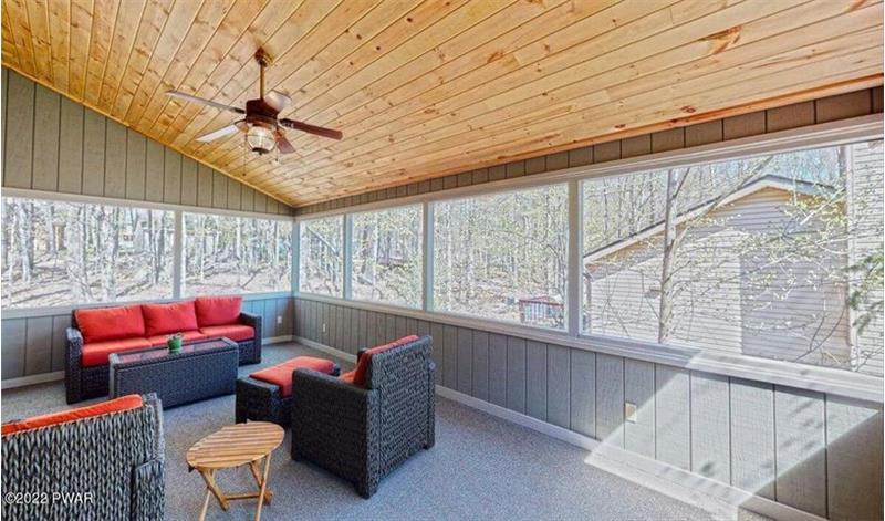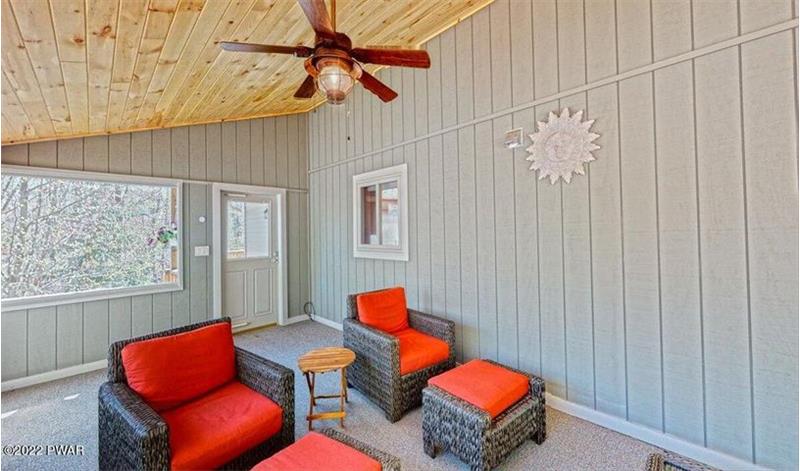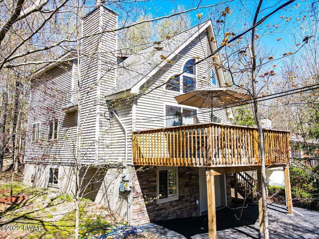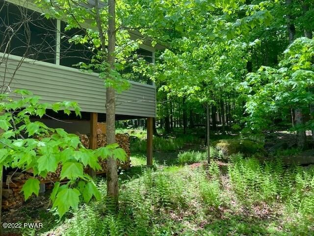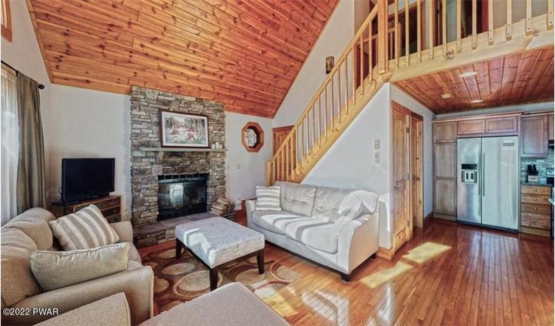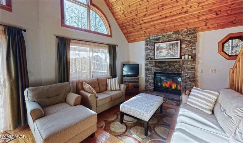 Prow-Front Chalet on a lush wooded lot features paved driveway, vinyl siding with stone accents and a three season enclosed porch. Inside find solid oak floors, knotty pine trim, ceilings, and solid knotty pine doors. Large primary bedroom and marble floored en-suite on the main level. Lower-level boasts tiled family room with Mr. Goodbar security windows, laundry room and access to the one car garage. All with in The Hideout: four season, “Gold Star”awarded, gated community.