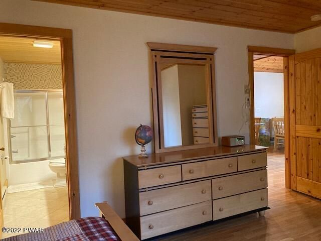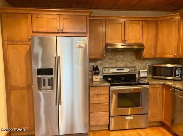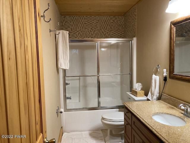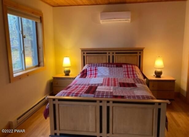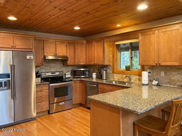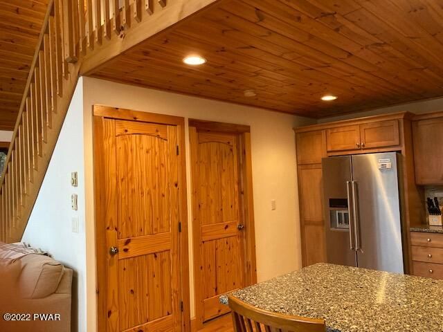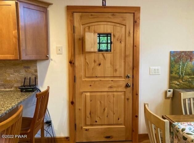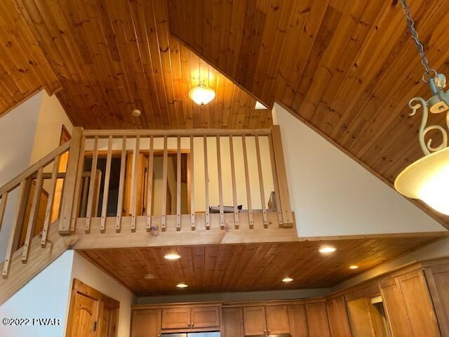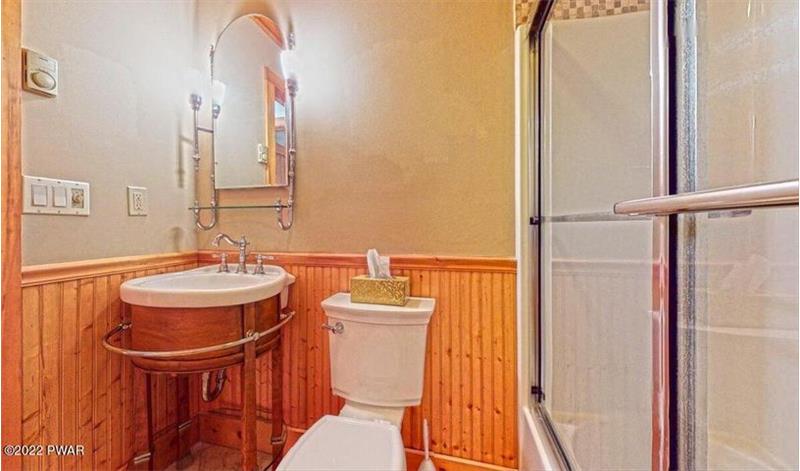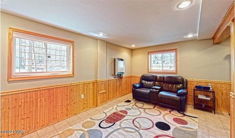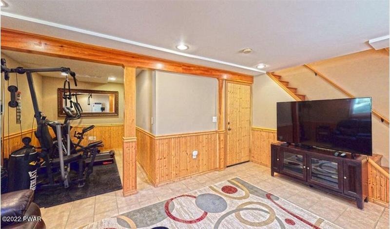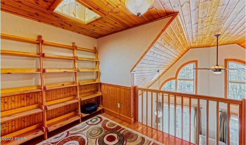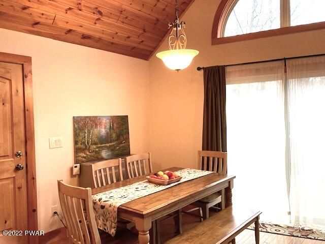 Prow-Front Chalet on a lush wooded lot features paved driveway, vinyl siding with stone accents and a three season enclosed porch. Inside find solid oak floors, knotty pine trim, ceilings, and solid knotty pine doors. Large primary bedroom and marble floored en-suite on the main level. Lower-level boasts tiled family room with Mr. Goodbar security windows, laundry room and access to the one car garage. All with in The Hideout: four season, “Gold Star”awarded, gated community.