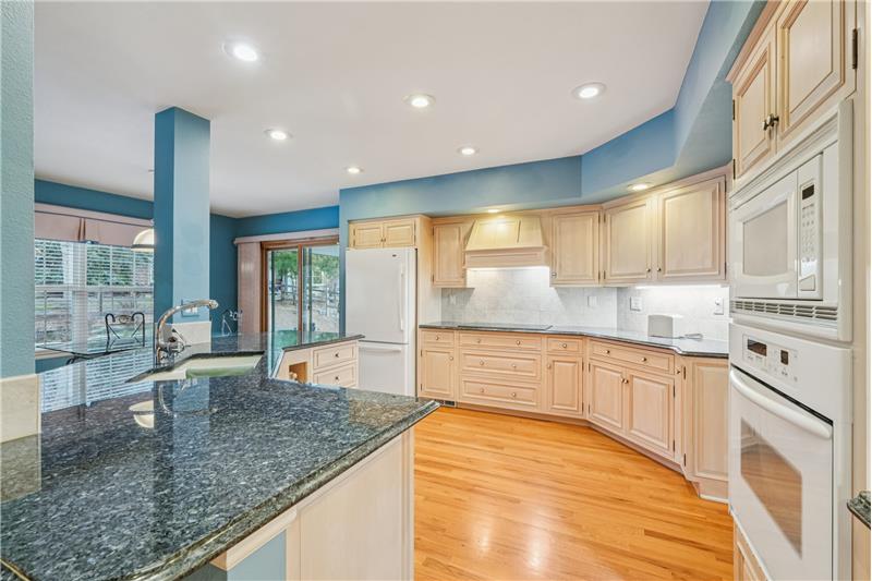 Come and see this nicely maintained home with the primary suite on the main level with 5-piece primary bath and a large walk-in closet. The kitchen has granite countertops, double sink, white appliances, lots of cabinet space, and a large eat-in area. This is an open floor plan featuring a spacious family room with a two-sided fireplace and vaulted ceilings, all with real hardwood flooring. When you enter the home there is a large foyer with a grand staircase, dining room, and living room with cove ceiling and hardwood floors and a powder room, butler's pantry, and a tiled laundry room. U ...