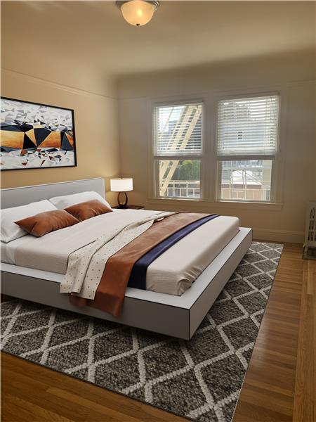 BRIGHT and SPACIOUS 1 bedroom apartment with remodeled bathroom and kitchen. There is hardwood flooring throughout the unit with gorgeous inlay work. The kitchen is fully remodeled with lots of storage, built in microwave and stainless steel appliances! There is also space for a dining table adjacent to the kitchen. This unit can also be used as a two bedroom unit as each room has a large closet. There is an exceptionally large closet, plus plenty of storage space! The building is well managed with a shared laundry facility.