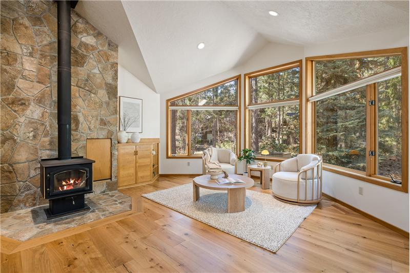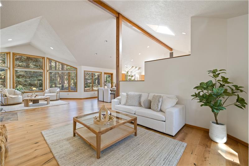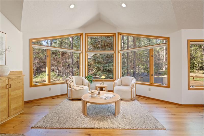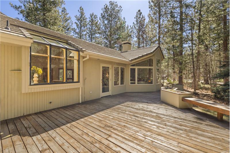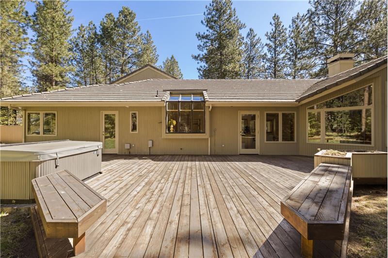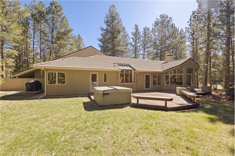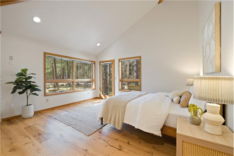 Living like a single level with a primary suite on the main floor, the high ceilings of the great room continue throughout the open floor plan filling the home with natural light. The kitchen is enhanced by a window looking out to the private backyard and expansive deck. An add'l main floor bedroom and bathroom are on the opposite side of the home, with a third bedroom & bathroom integrated into an upstairs bonus living area. Oversized 3-car garage includes room for a workbench & attic storage. Neighborhood amenities include community pool, tennis courts & trails with access to the Deschutes.