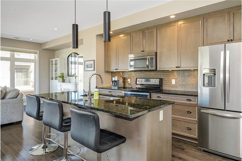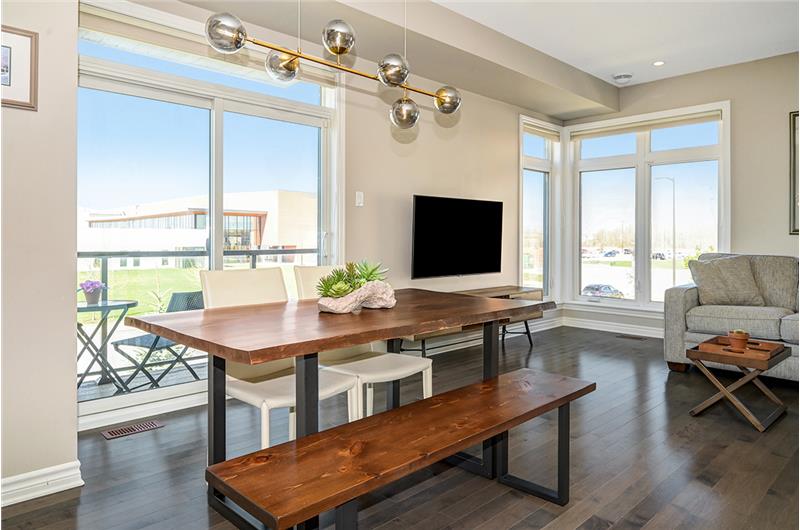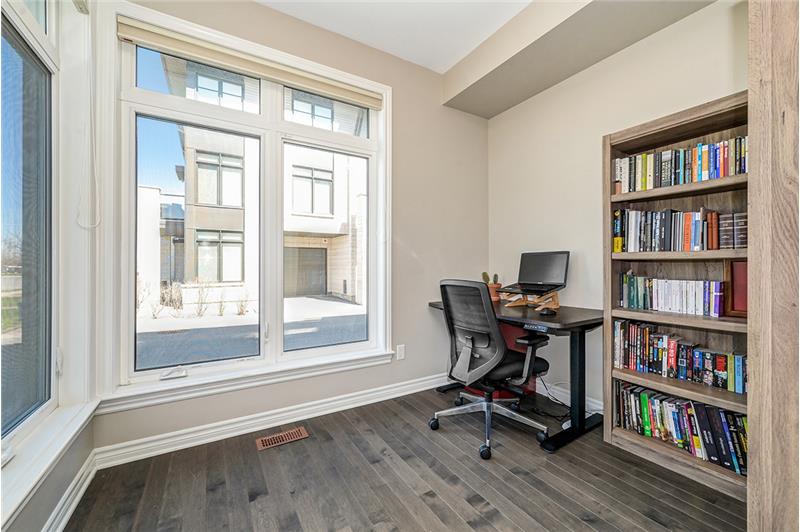 Stunning corner unit with sun-filled balcony, office space, modern kitchen, finished basement room, 2 large bedrooms, ensuite, laundry, and top location near shops, transit, and green space.