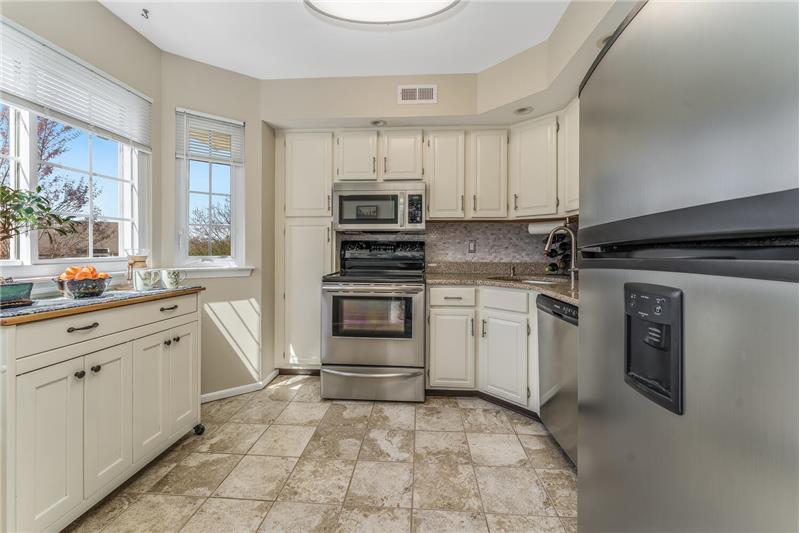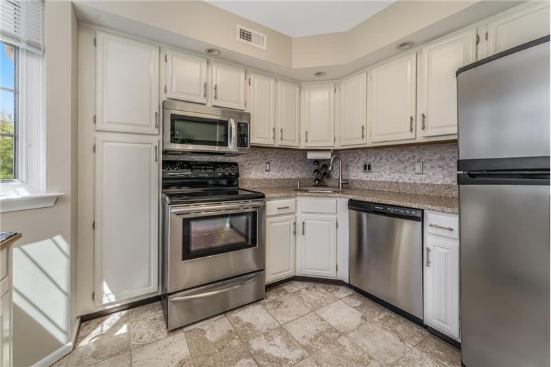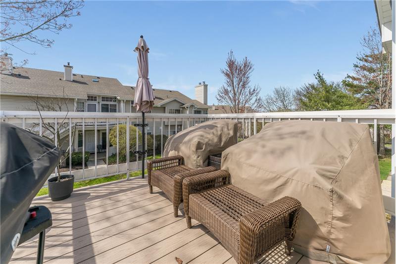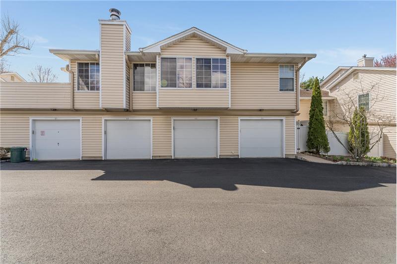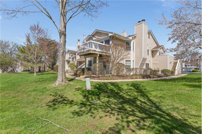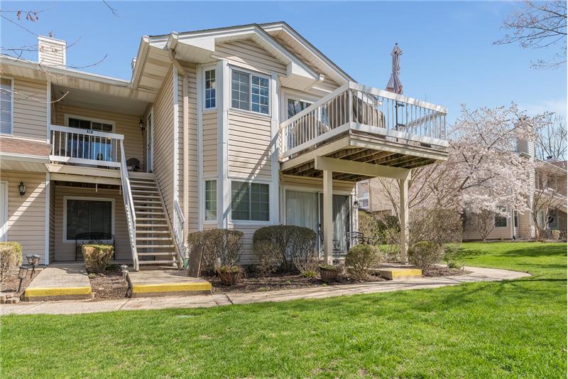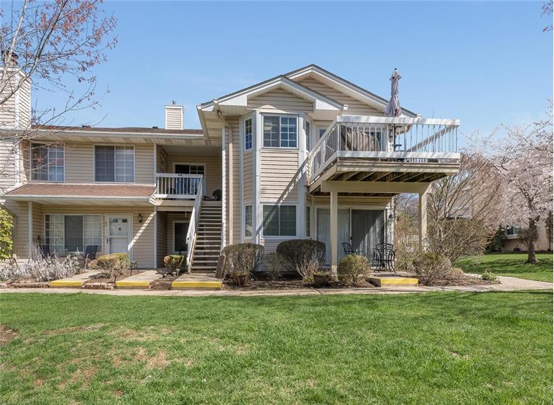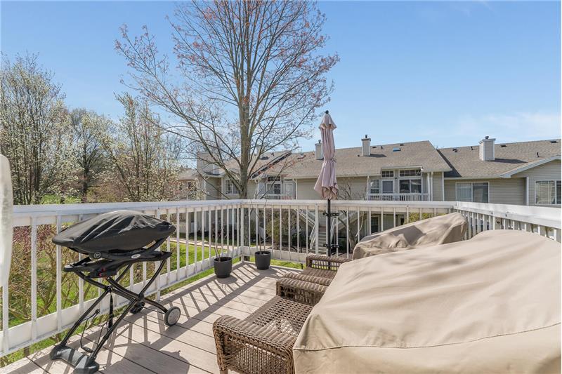 Wonderful second-floor location enjoying ample natural sunlight, this end-unit Fieldstone B model is move-in ready. Kitchen updated with granite counters and stainless steel appliances. Living room with a vaulted ceiling and wood-burning fireplace. Each bedroom connects to a full, updated bathroom. This lovely home features two distinct outdoor spaces: first, an open & sunny expanded deck, and second, a private porch with shaded seating area. Attached garage connects via interior staircase. Full-size laundry in-unit. Don't miss out on this well-maintained, turn-key home.