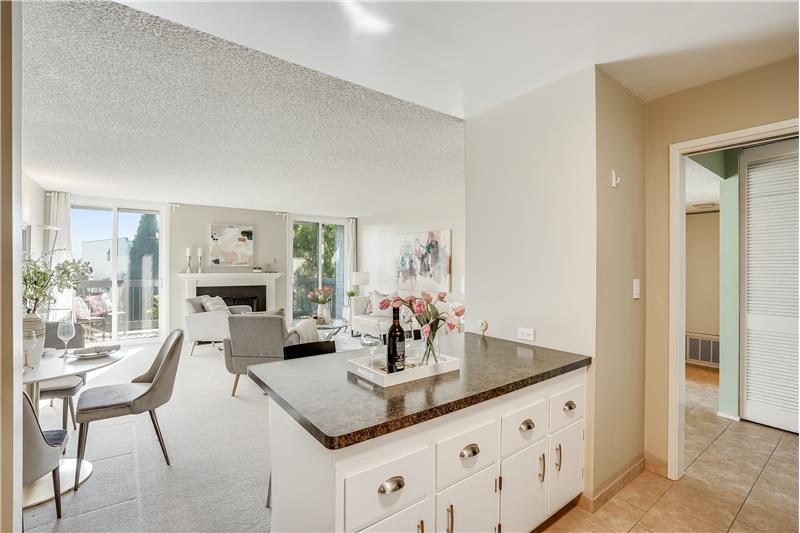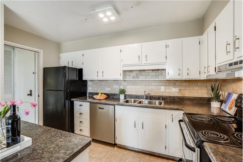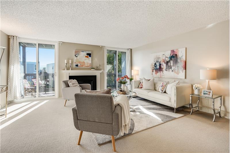 Located in the Mariner's Island Community, sheltered beaches are only a few steps away. The association's playground is right on a beach with the community swimming pool next to it. Why rent when you can own part of an island community with its own beach and swimming pool? This delightful condo has a spacious living room with a fireplace centered between two sets of sliding glass doors that lead out to its private balcony. The well planned kitchen features stainless steel appliances, white cabinets, lovely tile walls, faux stone counter tops, and a breakfast bar separating the kitchen from