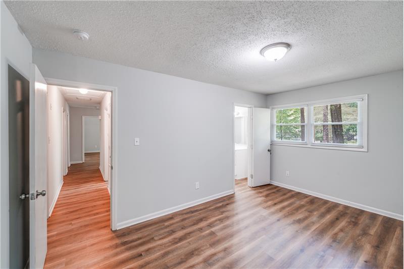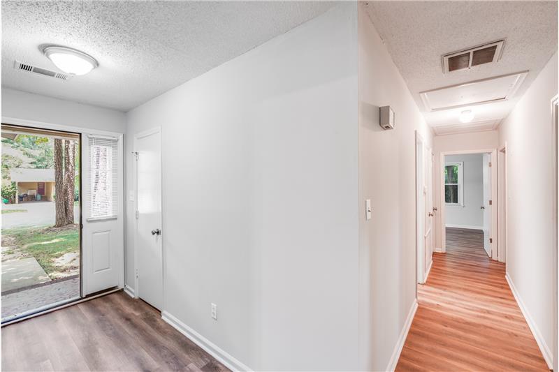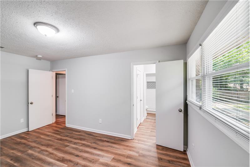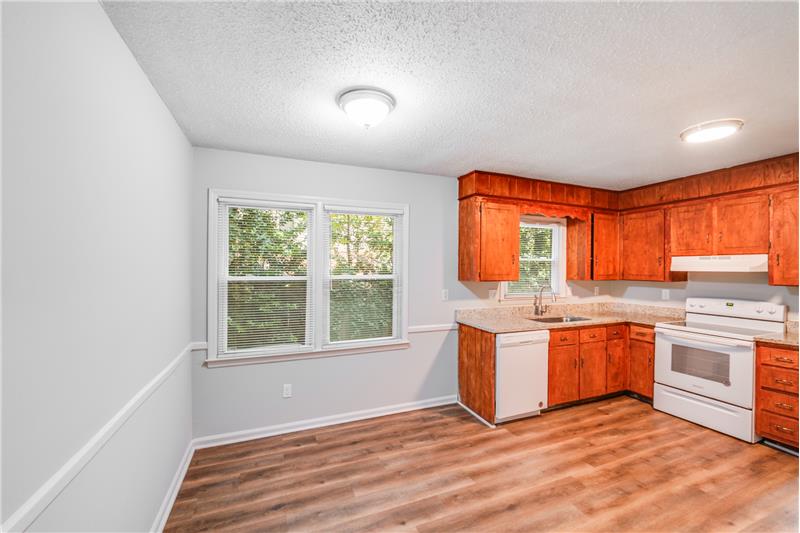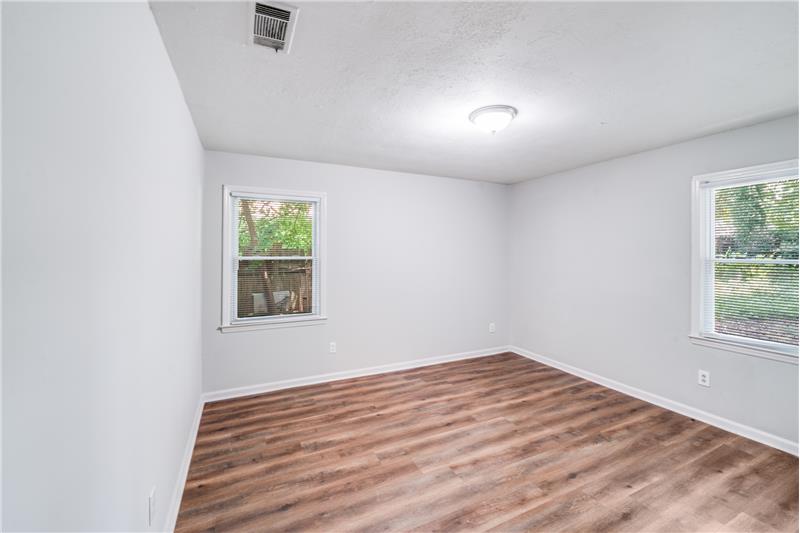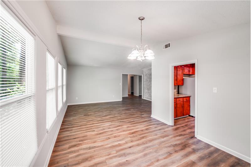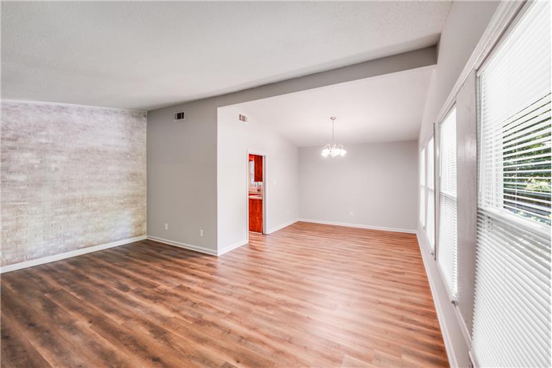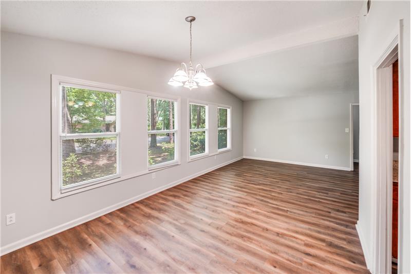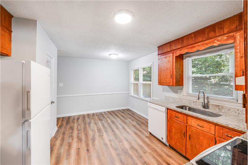Welcome to this charming 3-bed, 2-bath home in the heart of Charlotte, NC. This move-in ready residence features durable vinyl plank flooring throughout, combining modern appeal with low-maintenance living. Enjoy the privacy of a splitbedroom floor plan and extra storage. The kitchen features granite countertops, ample cabinetry, and a layout ideal for cooking and entertaining. Adjacent to the kitchen, the dining area boasts a soaring vaulted ceiling, creating an inviting and spacious atmosphere. Text "OldPost6513" to 704-870-2369.