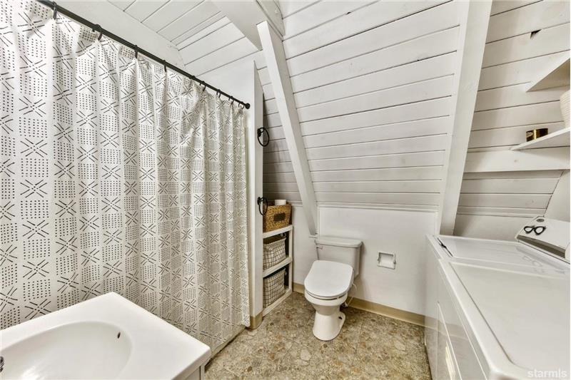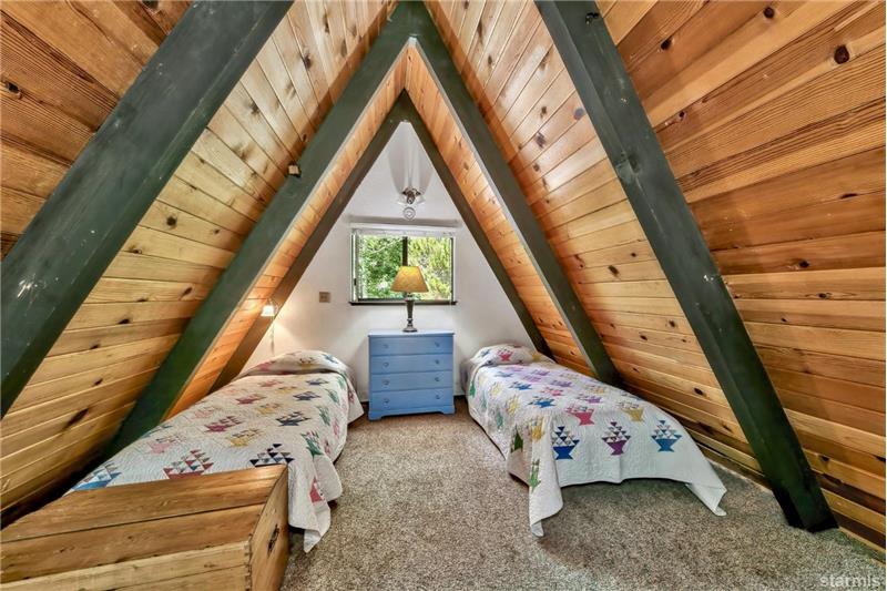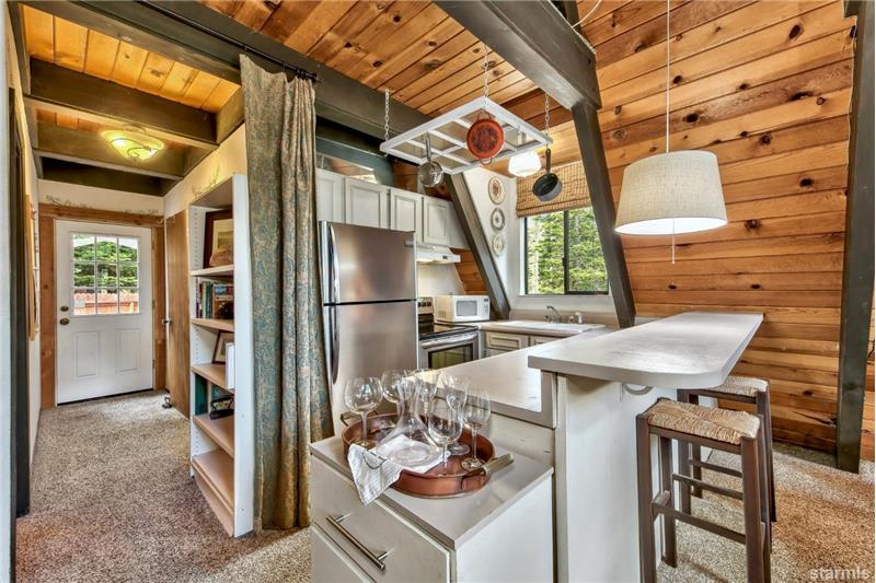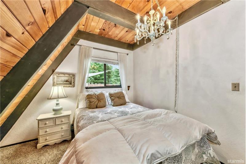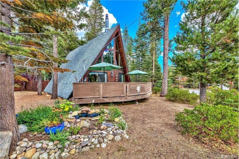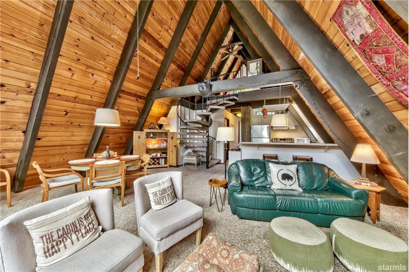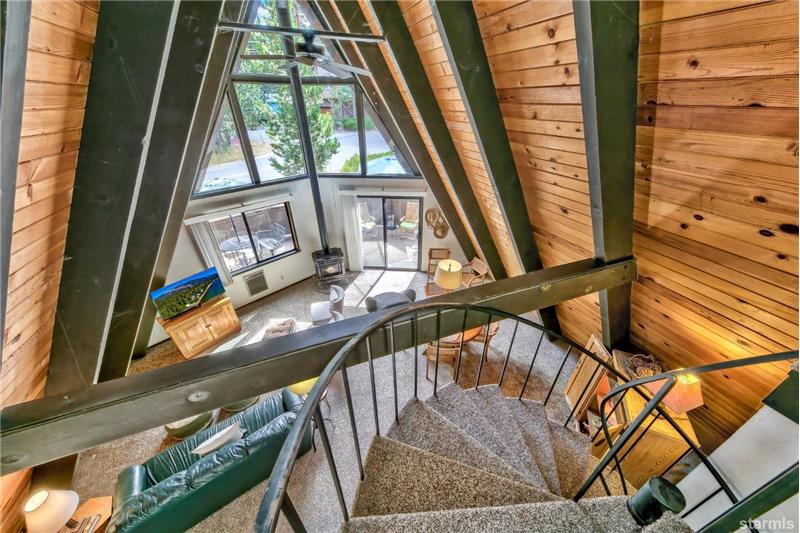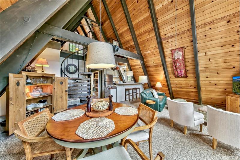 This Classic Prow-Front A-Frame Cabin perfectly captures the Tahoe lifestyle. Loved by the same family for 36 years. As you enter, the large, stacked windows fill the interior with natural light and brings the feel of the outdoors inside. The gorgeous gas log stove with Nest thermostat provides high efficiency heat and ambiance from the flames and embers for those snowy nights! Warm & cozy with all natural wood cathedral style beamed ceilings. Living, kitchen & dining areas plus a bedroom and bath at entry level. A sweeping spiral staircase to the spacious loft second sleeping area.