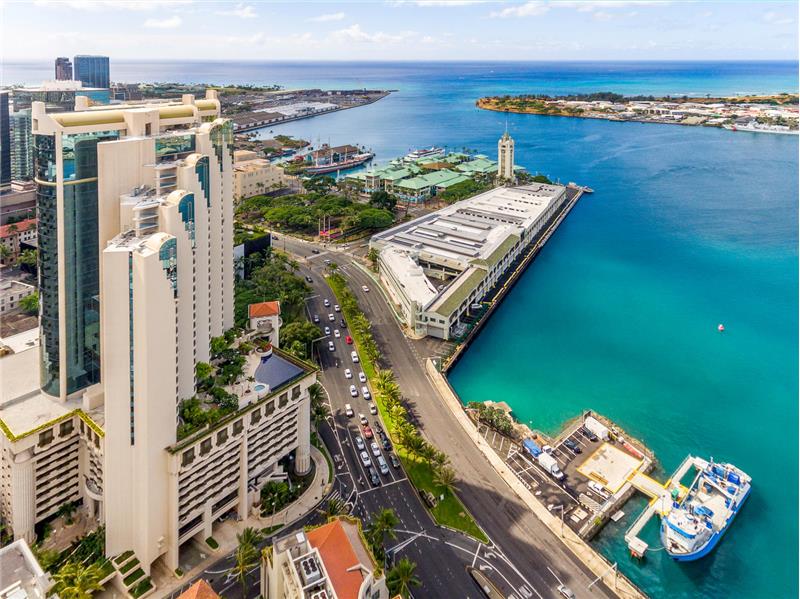 This spacious 2br/2ba w/2 PARKING STALLS upscale condo offers the finest in historic downtown living w/ floor-to-ceiling glass windows, an open & efficient floor plan. Located on the high 33rd floor overlooking the expansive ocean, Honolulu Harbor, iconic Aloha Tower lighthouse, and the brilliant colors of piers and city light views. Features new wood floors, central AC, privacy and quiet living. Harbor Court is an architectural landmark at the edge of downtown Honolulu, a well-maintained and secured luxury bldg with an array of amenities consisting of fitness center, meeting room, saltwa ...