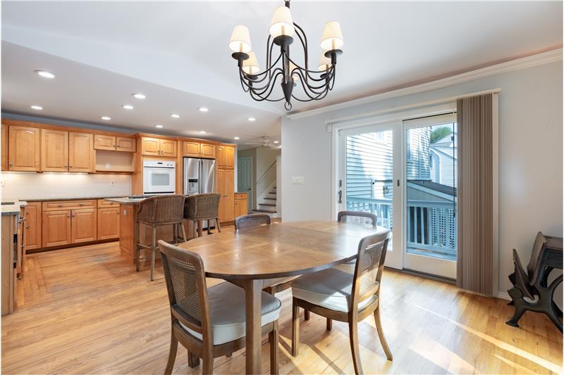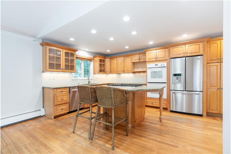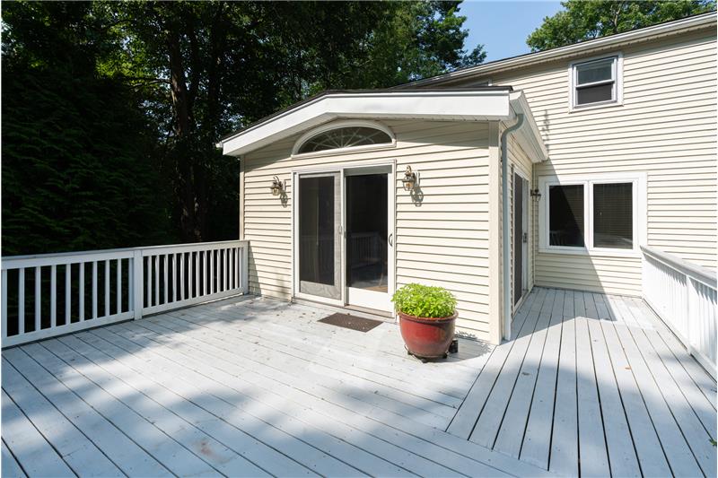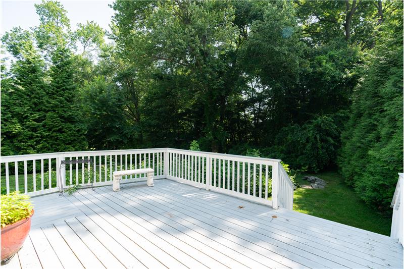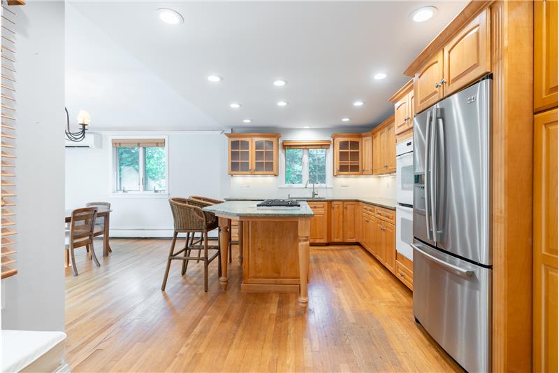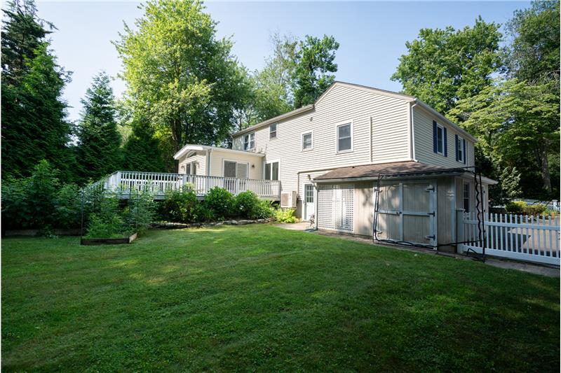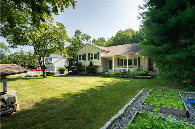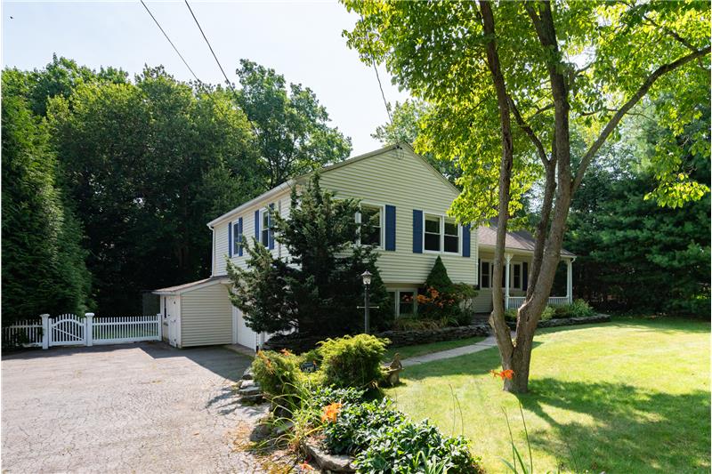 Split-level home on 1/2 acre/fully fenced in lot, with an excellent layout is located in a very desired area just steps to the water and 1-mile from downtown Madison. Last home on dead-end street. Light and bright everywhere. Hardwood floors throughout. The spacious eat-in kitchen is complete with granite countertops, island, double wall oven, propane cooktop, ample cabinet and counter space, dining area and sliders leading to the L-shaped deck. Living room with fireplace. 3 bedrooms on the 2nd floor, full bath and a huge primary bedroom suite nestled up on the 3rd level.