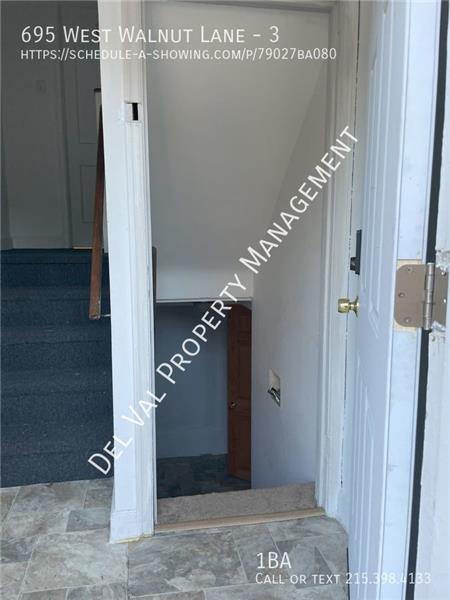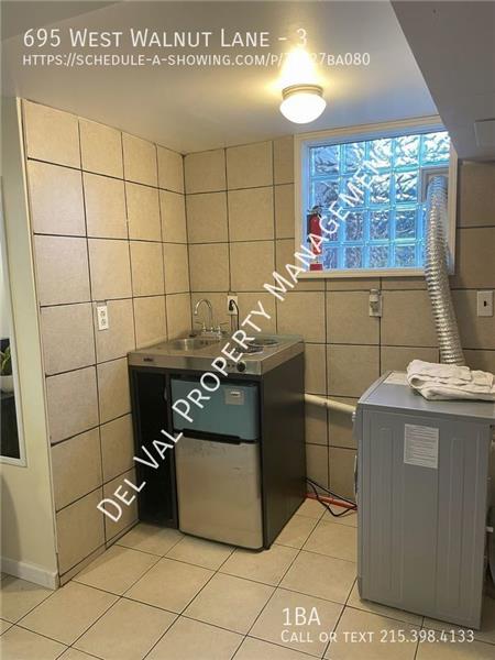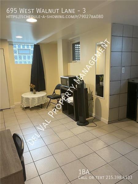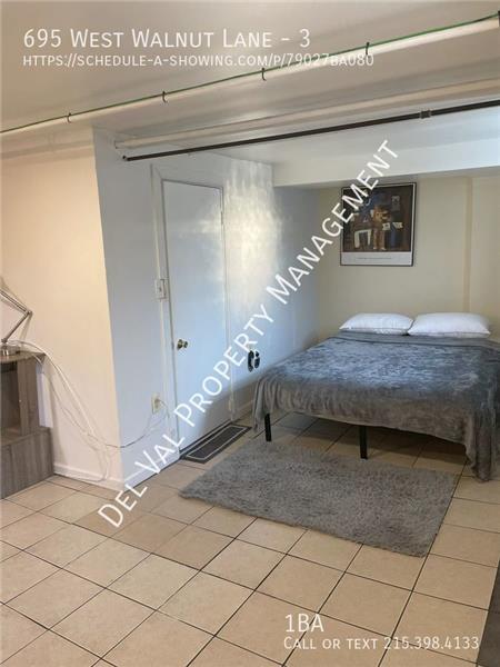 About this Property: Charming Studio - For Rent– 695 W. Walnut Street – Available Now in Blue Bell Hill! $765 / month plus Electric, Landlord pays for Gas and Water Furnished Efficiency 1 Bathroom Ample street parking available Well sought after West Walnut Lane area Short distance to Center City Philadelphia School District Walk to public transportation (Bus 65) and Blue Bell Park with many walking and biking trails UPenn and Drexel University are only 10 minutes away Internet Cable Line hookup Shared yard