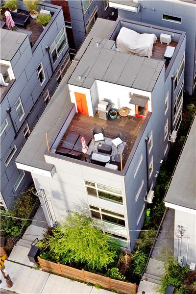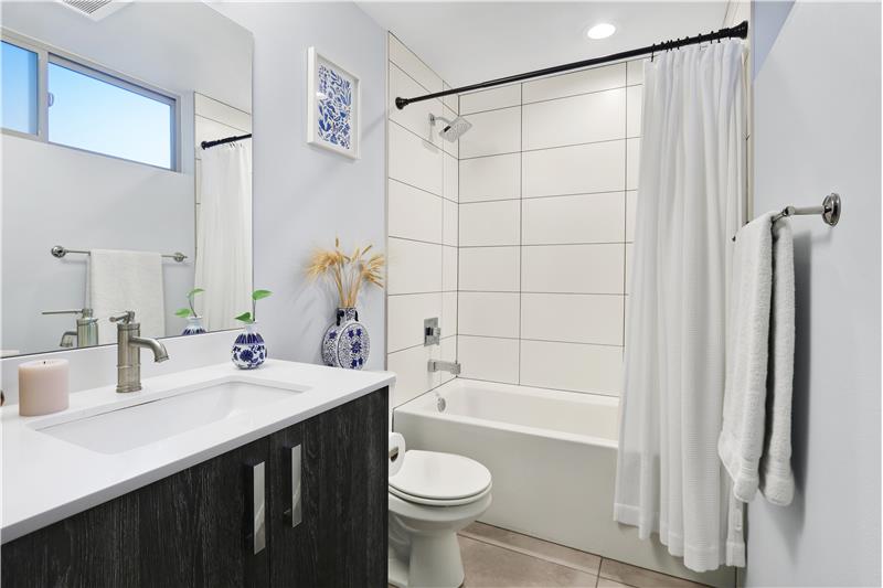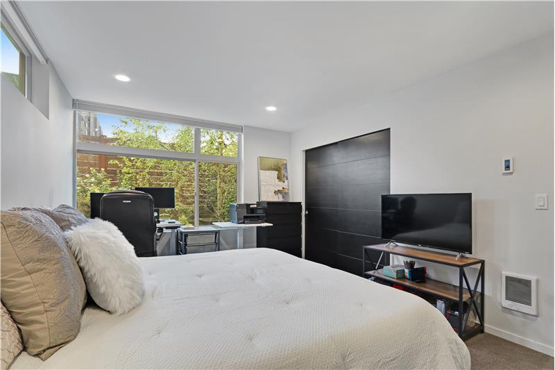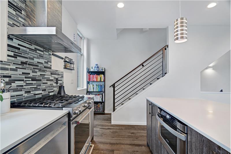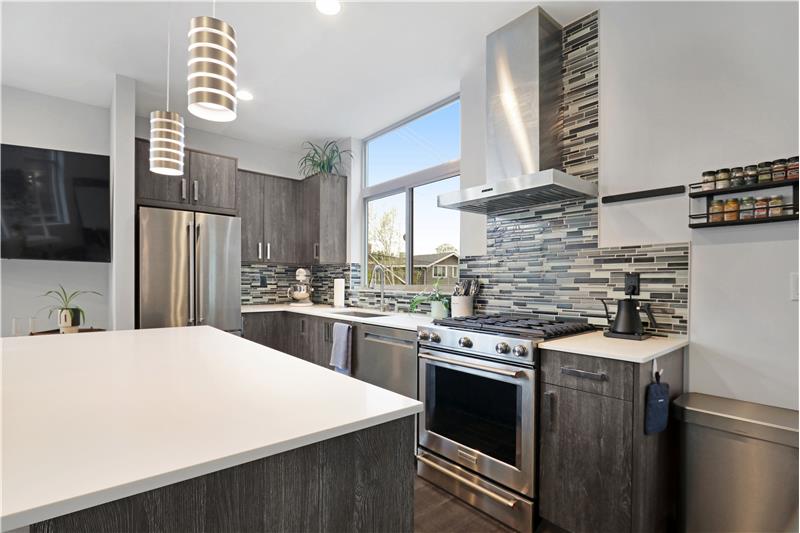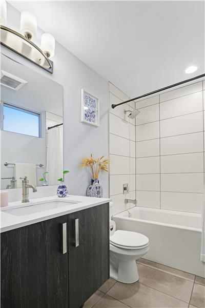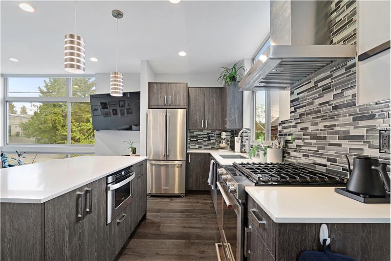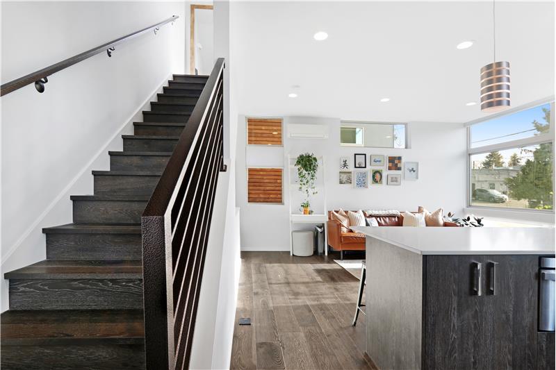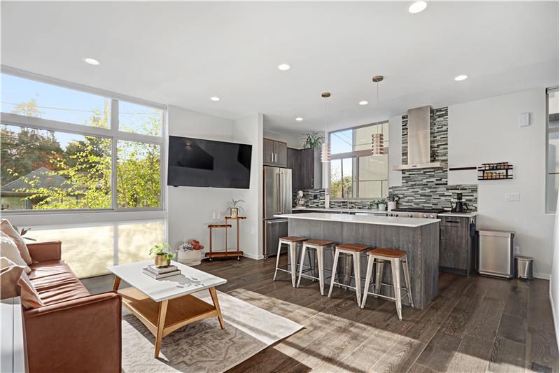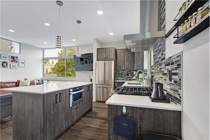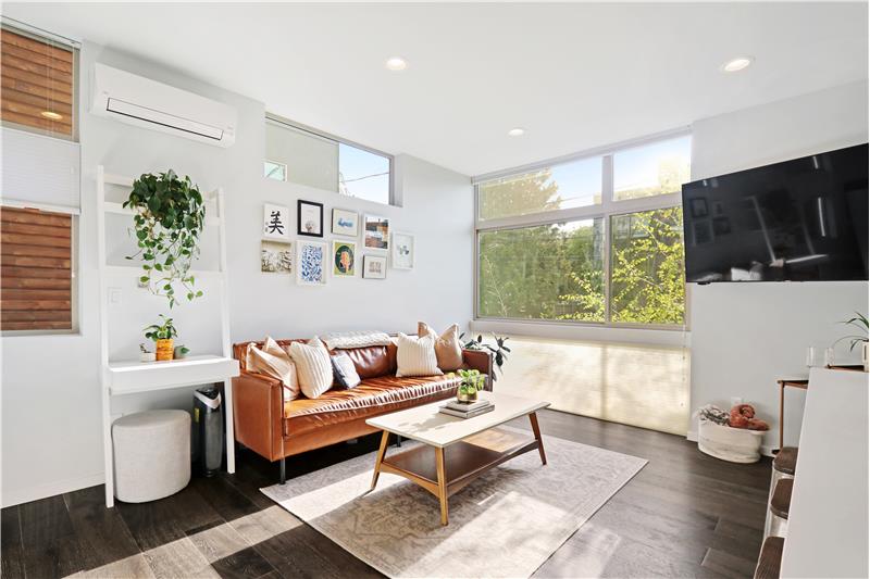 Elegantly designed with High-end finishes, Open & Airy living spaces with lots of natural light, Hardwood floors, Central A/C, Quartz countertops & glass tile backsplash. Premium SS appliances, cellular blinds, breakfast bar & more. Other Features include spacious Primary bedroom with ensuite bath plus a 2nd bedroom & bath. A Grand Roof-top deck perfect for entertaining & enjoying sunny days,String lights included. High efficiency Ductless heat pump for heating/AC, Central vacuum & Tankless Water Heater. Off street parking space, minutes from restaurants and everything Madrona has to offer.