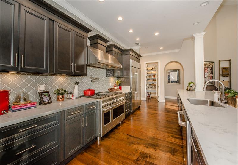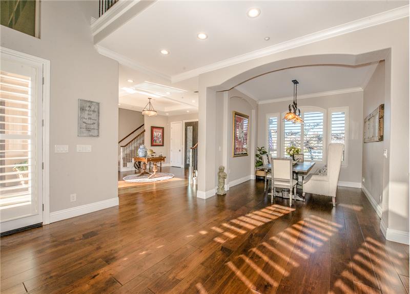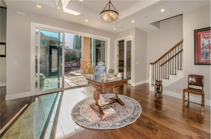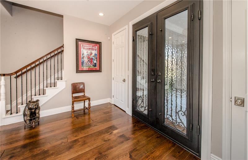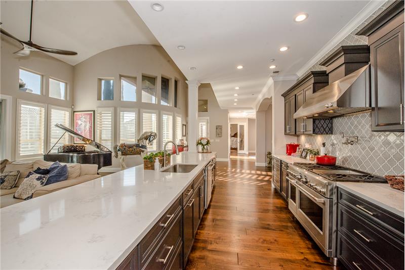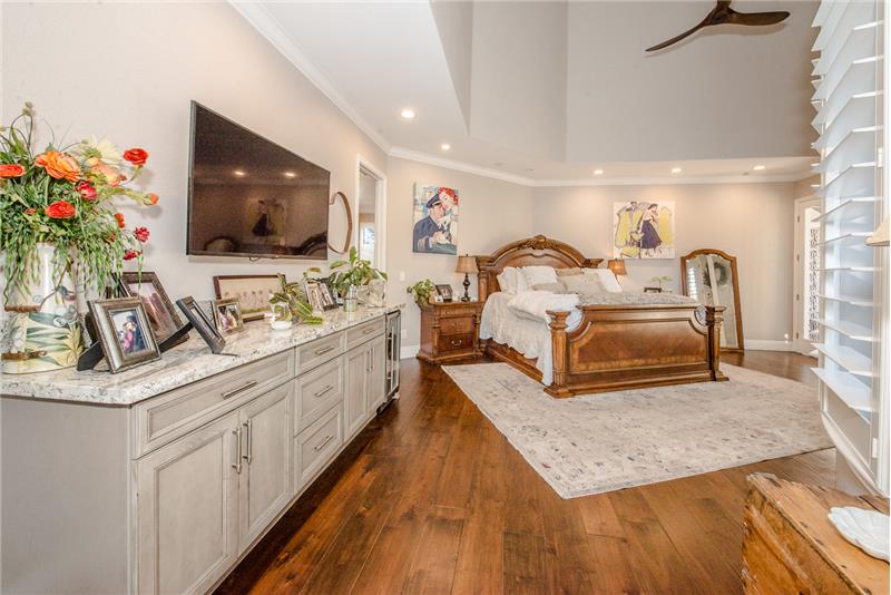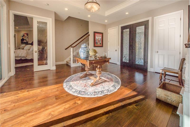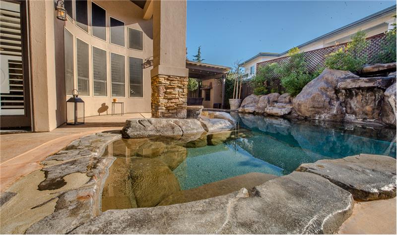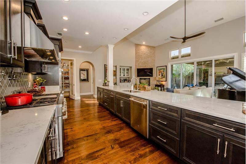 Remodeled with impeccable taste in Woodland's luxury gated Meadowood community. This entertainer's home features double glass front doors to the grand entry, formal dining room, open-flow great room and kitchen, downstairs master suite, upstairs family room, and four additional upstairs bedrooms. Custom home features at every turn: carpeted garage with workshop, picture windows bathing the home in natural light, handsome wood floors, three gas fireplaces, crown moldings, exquisite lighting fixtures, plantation shutters, and more. The gourmet kitchen boasts black cabinetry, quartz countert ...