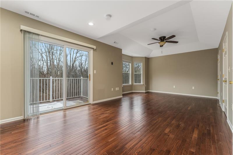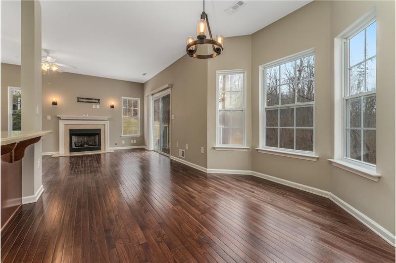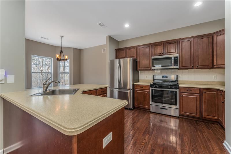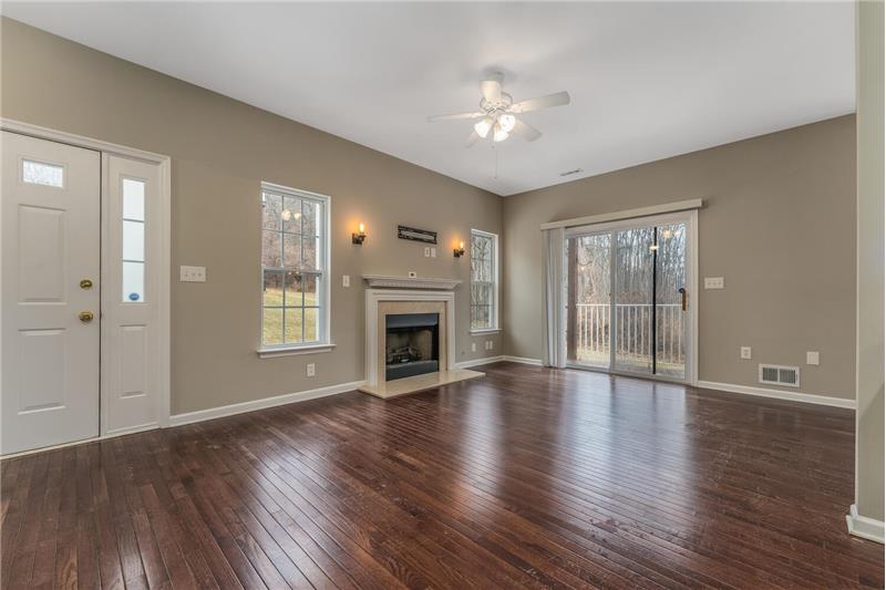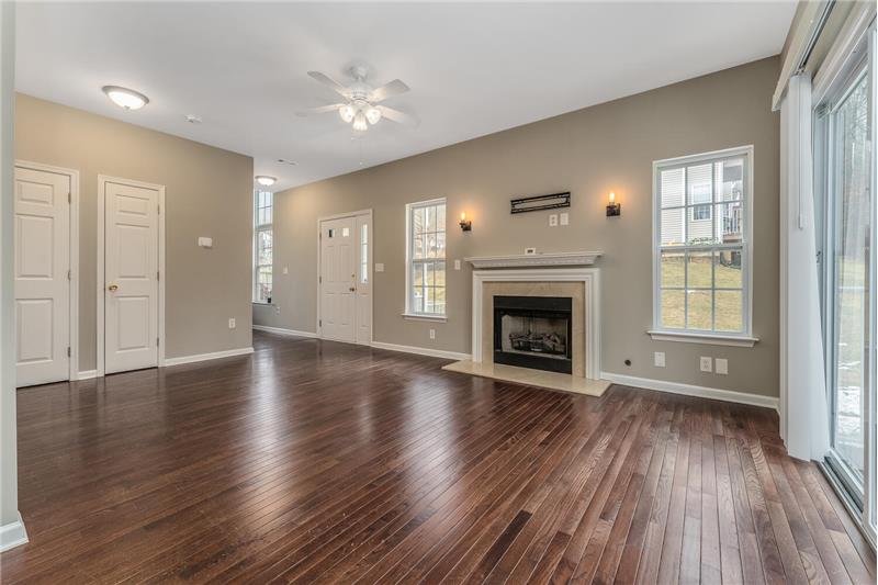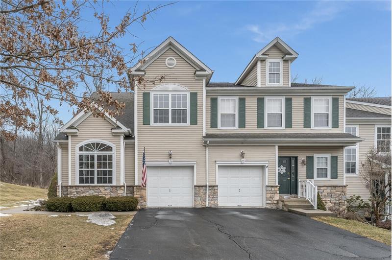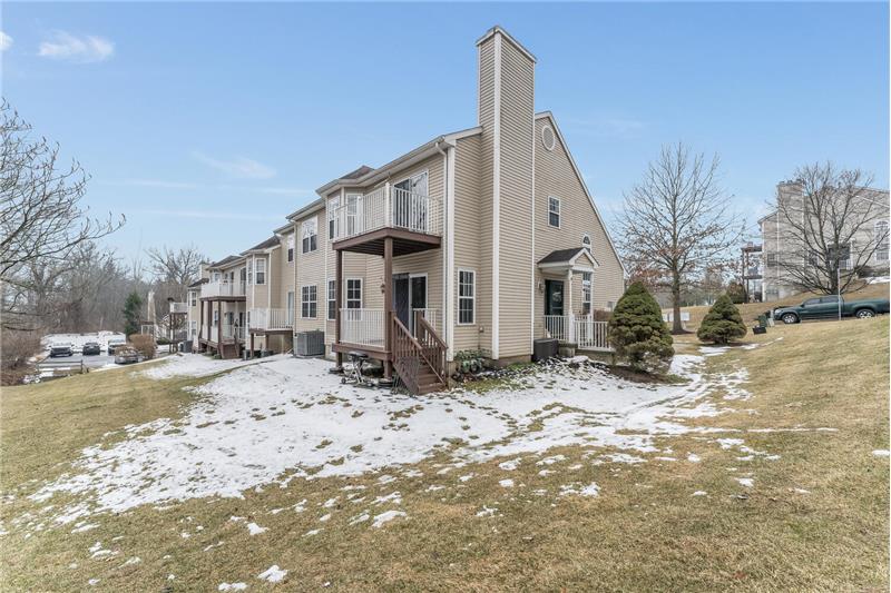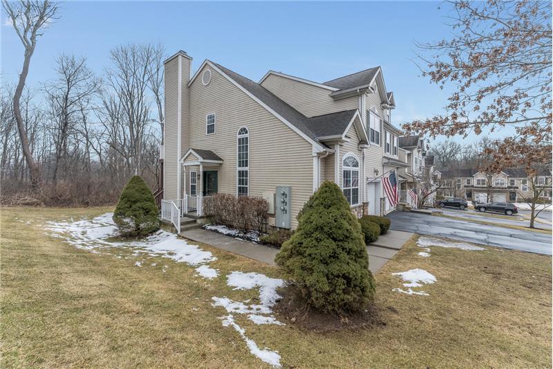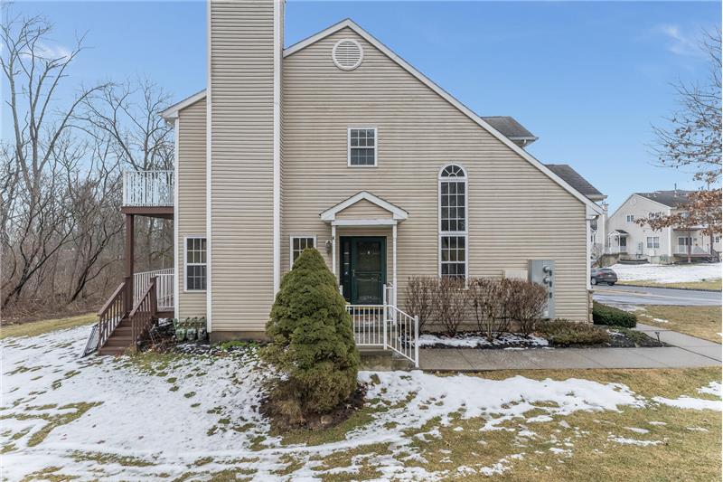 End-unit, three levels of living space. Superb location backing to woods. Wood flooring throughout main & second levels. Relaxing open floorplan. Kitchen with island seating, SS appl, cherry cabinets. Cozy gas fireplace and private deck. Den/family room with vaulted ceiling would also be a great office, with powder room nearby. The main bedroom features a balcony, walk-in closet, and large en suite bathroom with soaking tub. Finished basement with additional storage closets. Attached one-car garage. Fairway Greens is a serene community with pool and tennis courts, in a lovely natural setting.