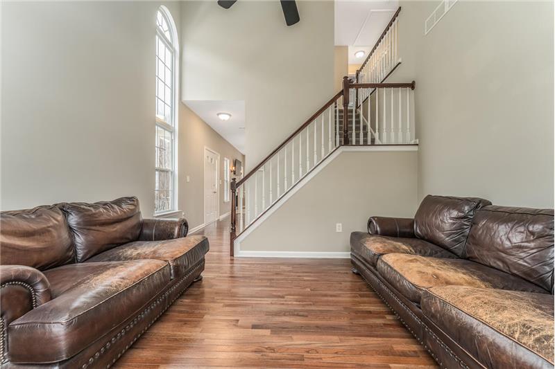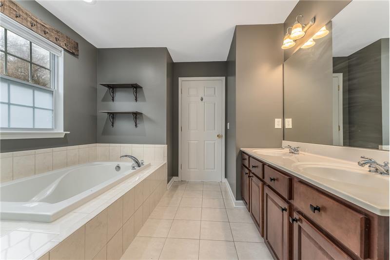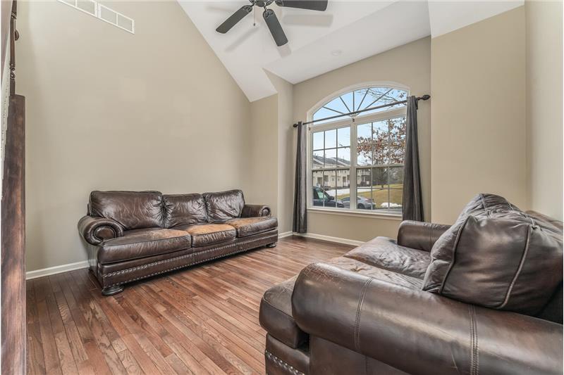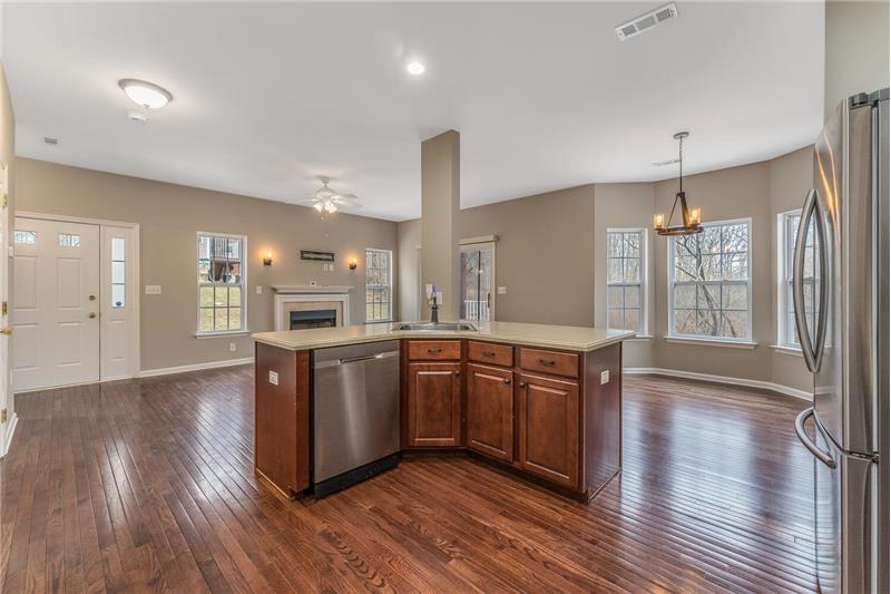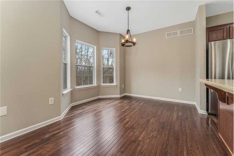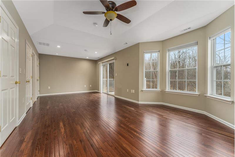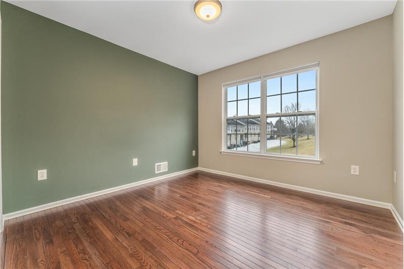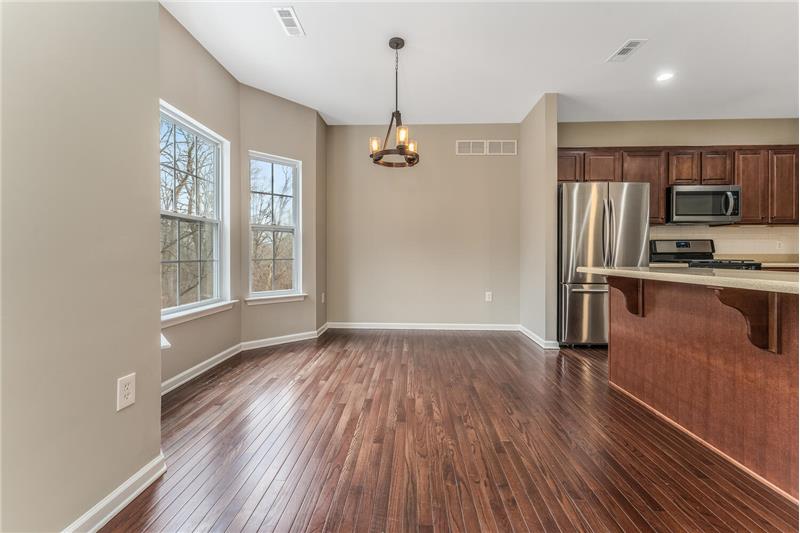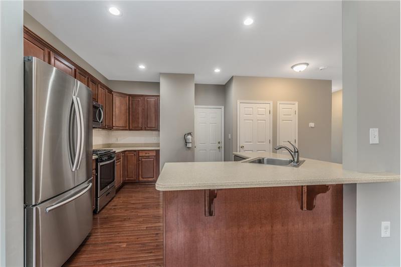 End-unit, three levels of living space. Superb location backing to woods. Wood flooring throughout main & second levels. Relaxing open floorplan. Kitchen with island seating, SS appl, cherry cabinets. Cozy gas fireplace and private deck. Den/family room with vaulted ceiling would also be a great office, with powder room nearby. The main bedroom features a balcony, walk-in closet, and large en suite bathroom with soaking tub. Finished basement with additional storage closets. Attached one-car garage. Fairway Greens is a serene community with pool and tennis courts, in a lovely natural setting.