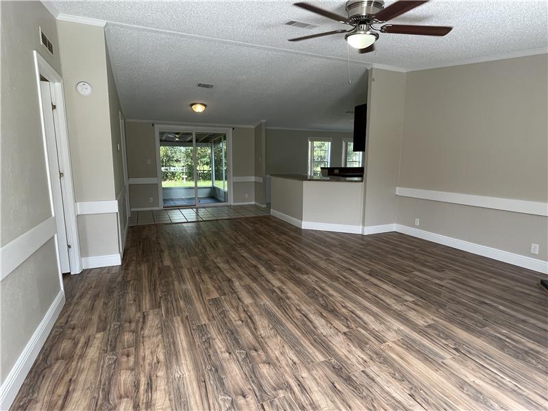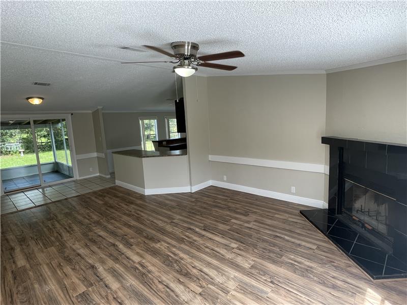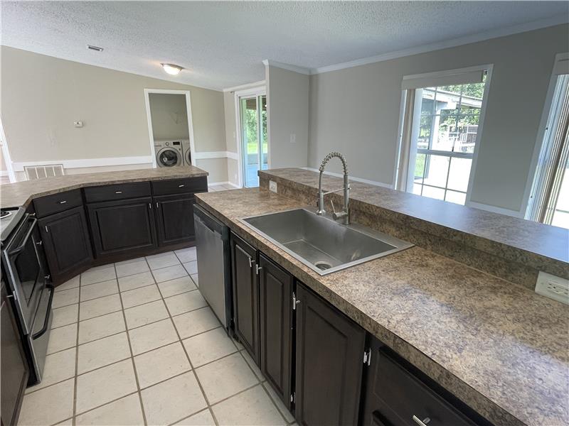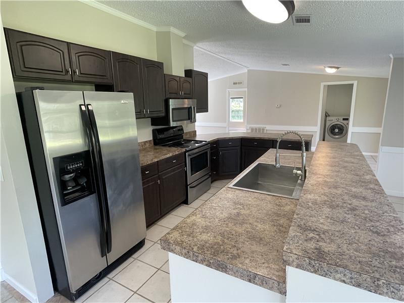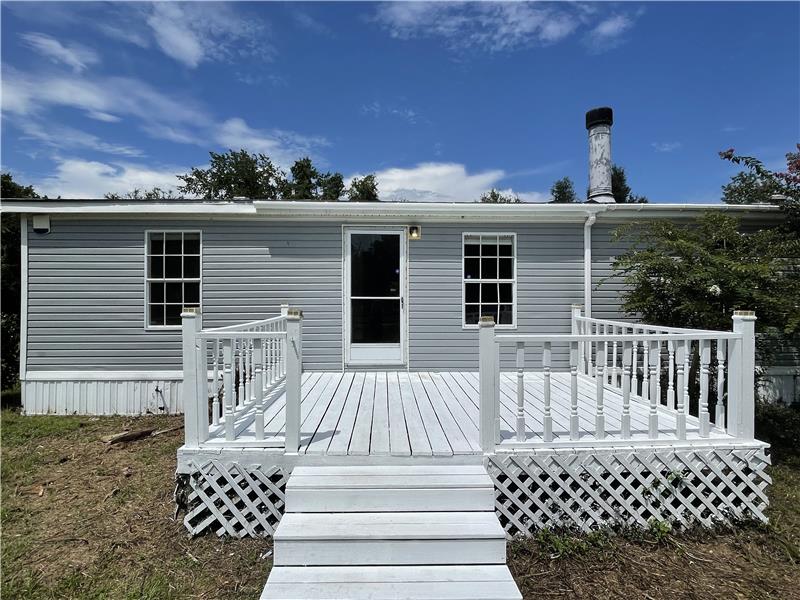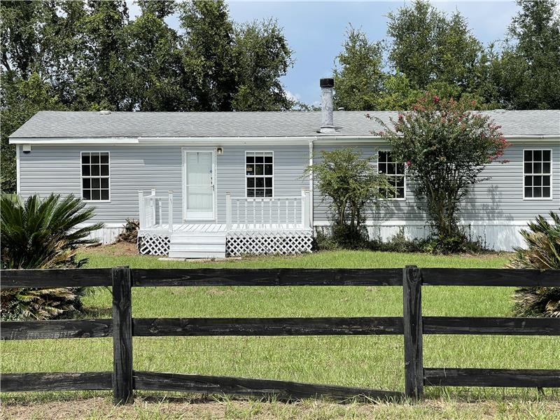Discover this charming 3-bedroom, 2-bathroom mobile home nestled on a serene 1-acre lot in the countryside. Surrounded by upscale executive-style homes and backing onto rolling pastureland with grazing cattle, this property offers a peaceful retreat. The inviting front porch leads into a spacious Great Room, featuring a Living Room with vaulted ceilings, large windows for ample natural light, a tiled wood-burning fireplace, and laminate wood flooring. The open Kitchen boasts stainless steel and black appliances, a farmhouse-style sink with a pull-down faucet, dark wood cabinets, neutral-ton