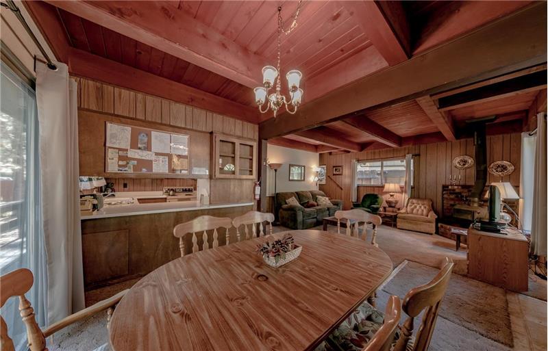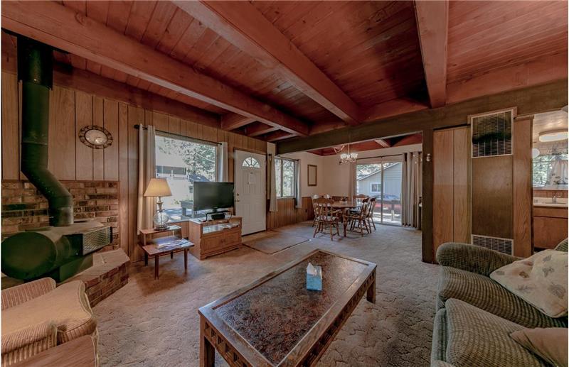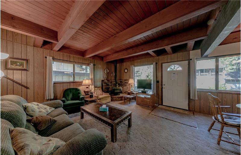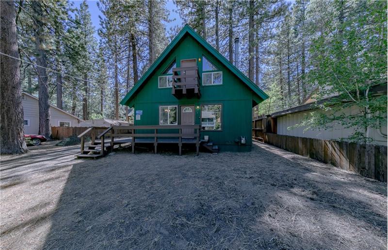 Clean and cozy, well maintained and completely furnished Chalet in a great neighborhood. This home has excellent vacation rental history with the long time owners. Open beam ceilings in the living room and in the spacious bedrooms upstairs give the home a mountainy feel. Artistic, stain glass window accent several areas of the home. There is a large laundry room with access to the side/back of the yard. A large, wrap around deck has been newly stained. From this neighborhood, you can ride your bike to the nearby bike trails and public beaches. Easy level access in the snow months. Clean as a w