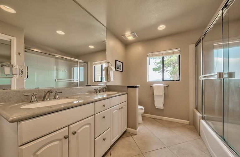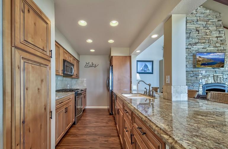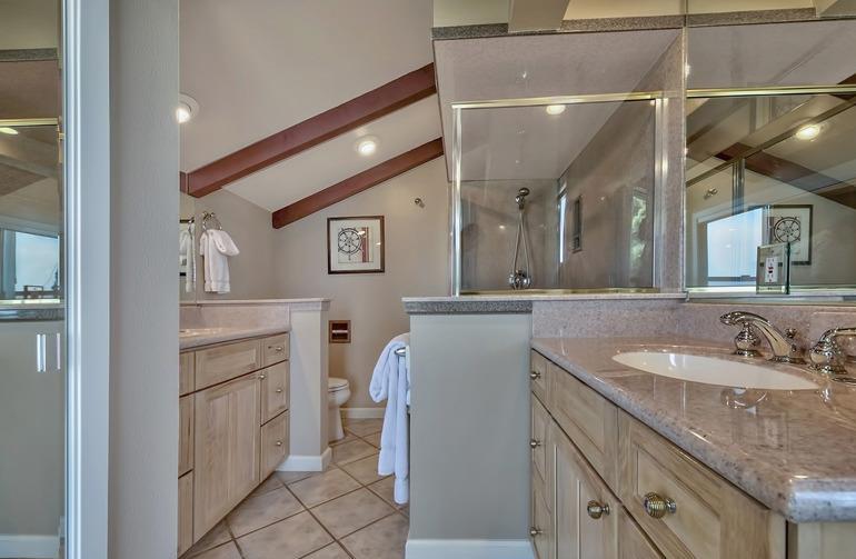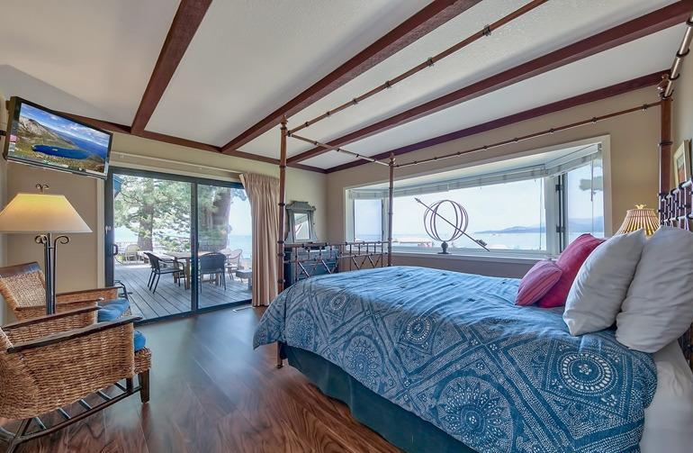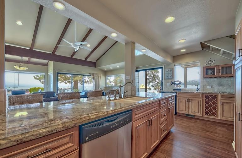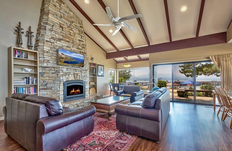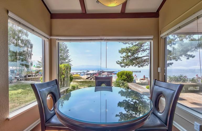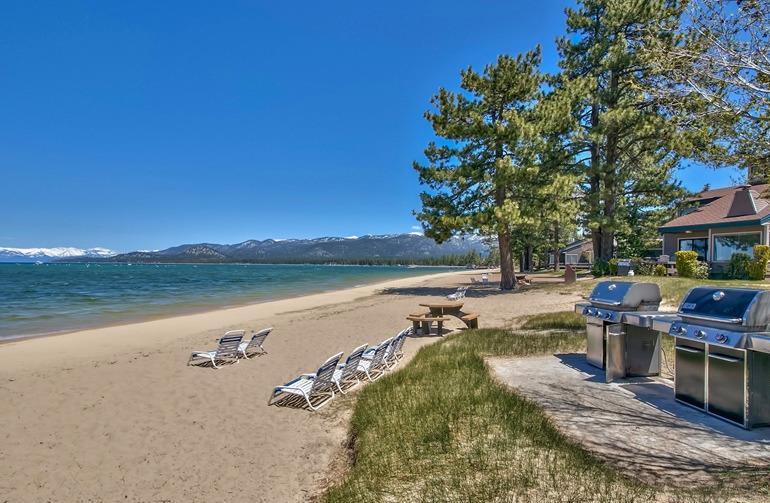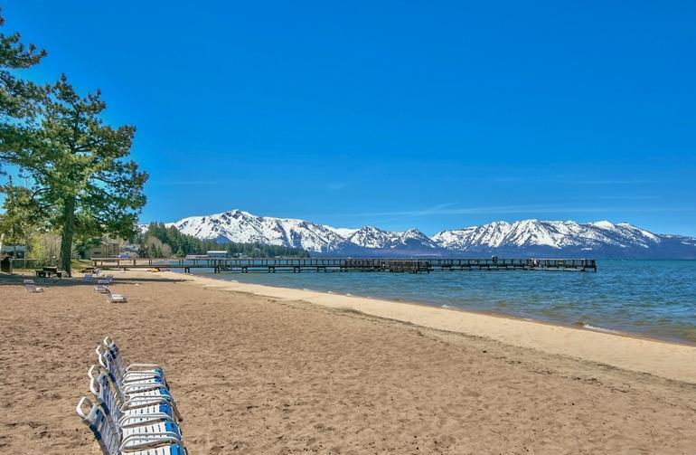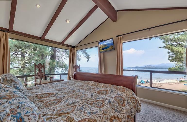 On the beach with over 100 linear feet of unobstructed lake and mountain views from the 1st and 2nd stories. The large wrap around deck is on the Lake Tahoe sand. This 6 bedroom, 5 bath grossed over $170,000 in 2016. The first floor has two master suites both with large baths and dual sink vanities. The second floor has a 3rd master suite with floor to ceiling windows giving the feel that you are standing on the lake. The loft is the 6th bedroom and it has its own bath and views of the lake. The kitchen has high quality pine cabinets, quality granite slab counters with an designer travertine t