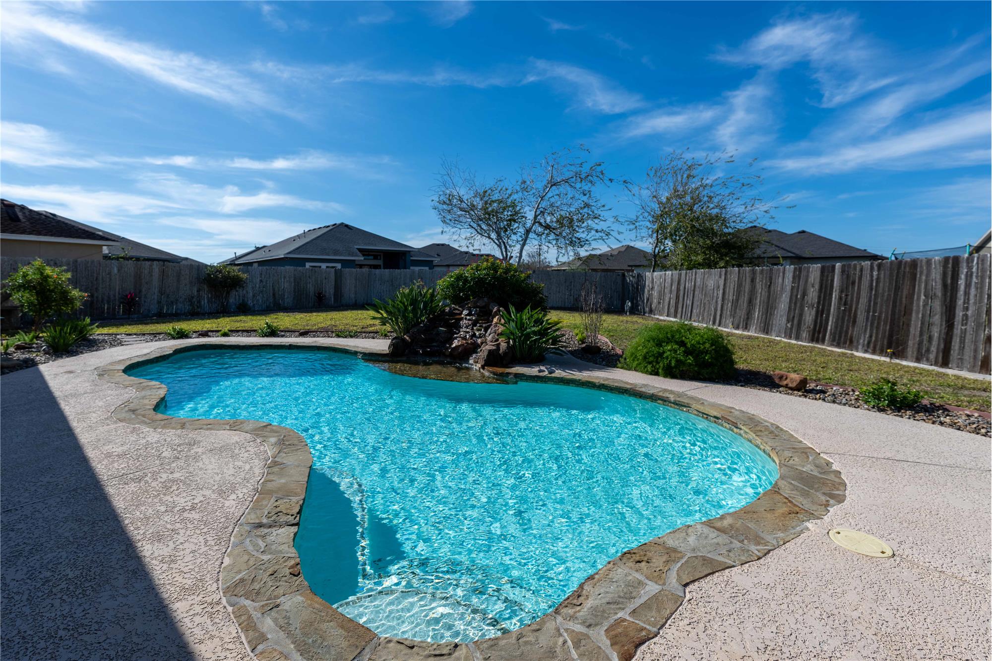 Discover your outdoor retreat with a stunning pool featuring a waterfall, a separate hot tub and inviting outdoor living spaces. Backyard is spacious, plenty of room for gardens and play equipment.