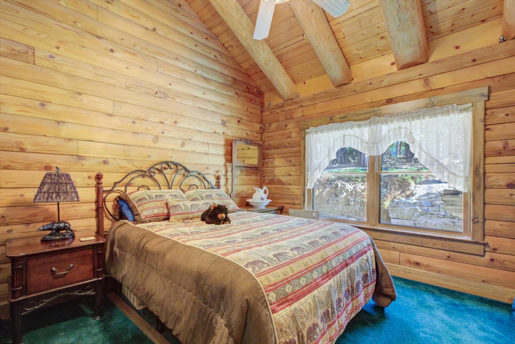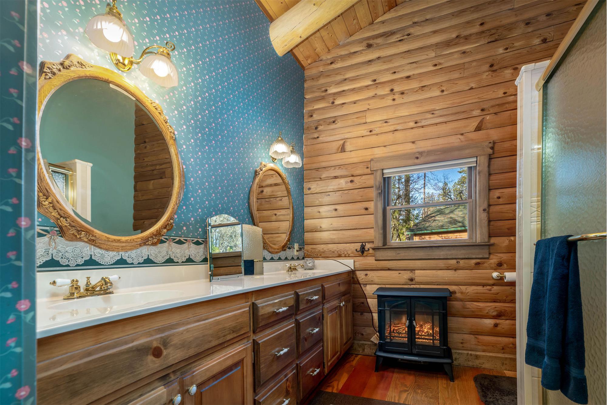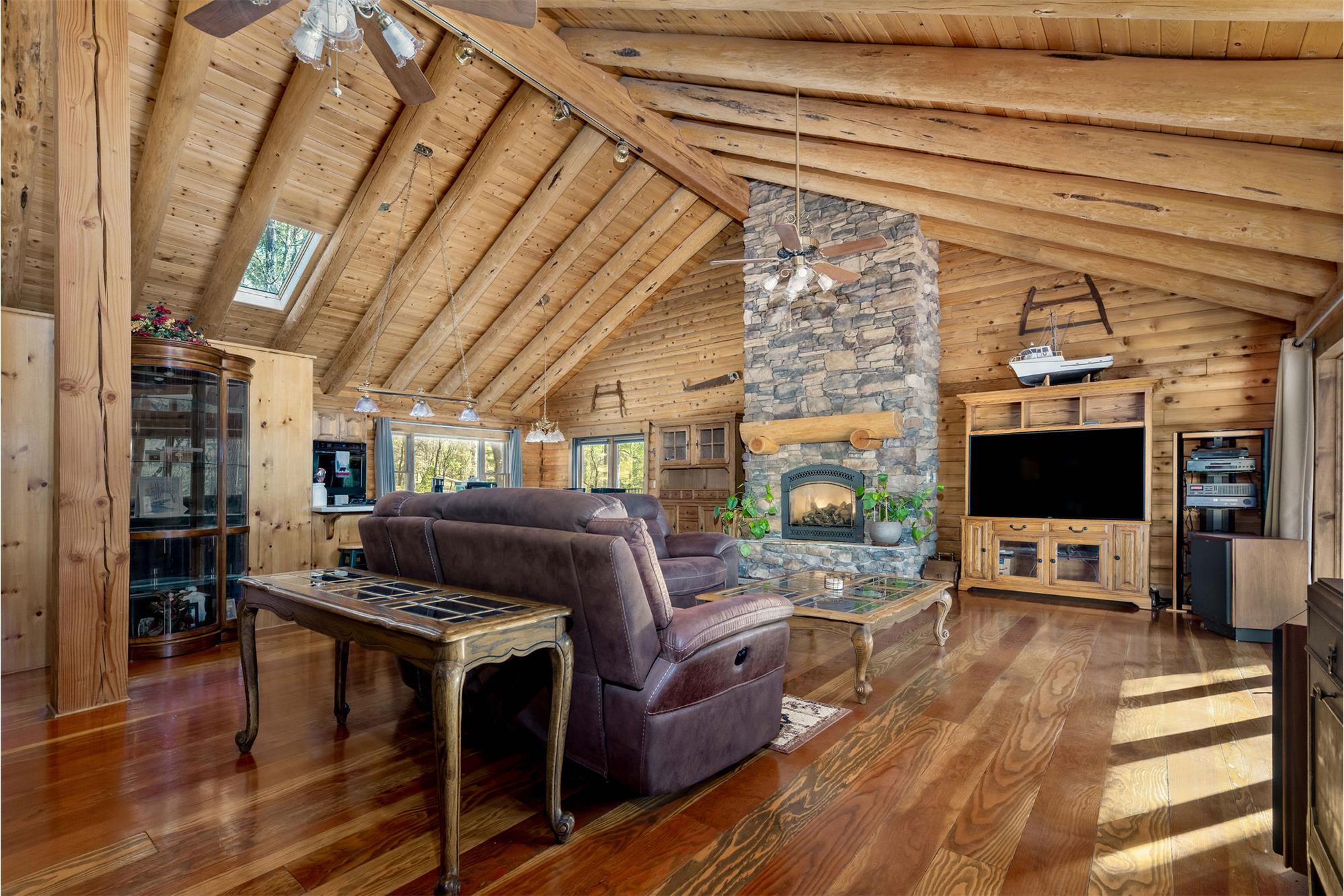 As soon as you step inside, you’ll be mesmerized by the soaring cathedral ceilings that brighten the space and create a feeling of openness and joy. Sunlight pours in from large windows, casting a warm glow on the rich wooden accents of this log-style masterpiece and massive rock fireplace. Every corner invites you to relax and unwind.
